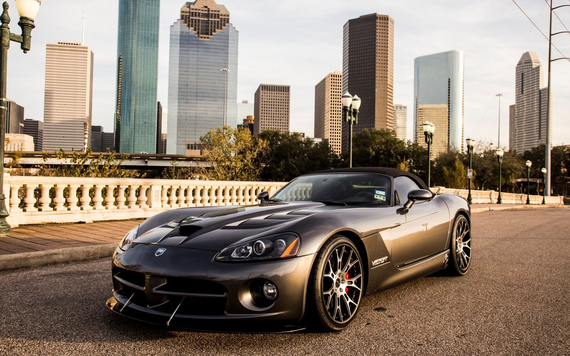 Description: A sports car parked on the side of the road in front of a city skyline with tall buildings in the background.