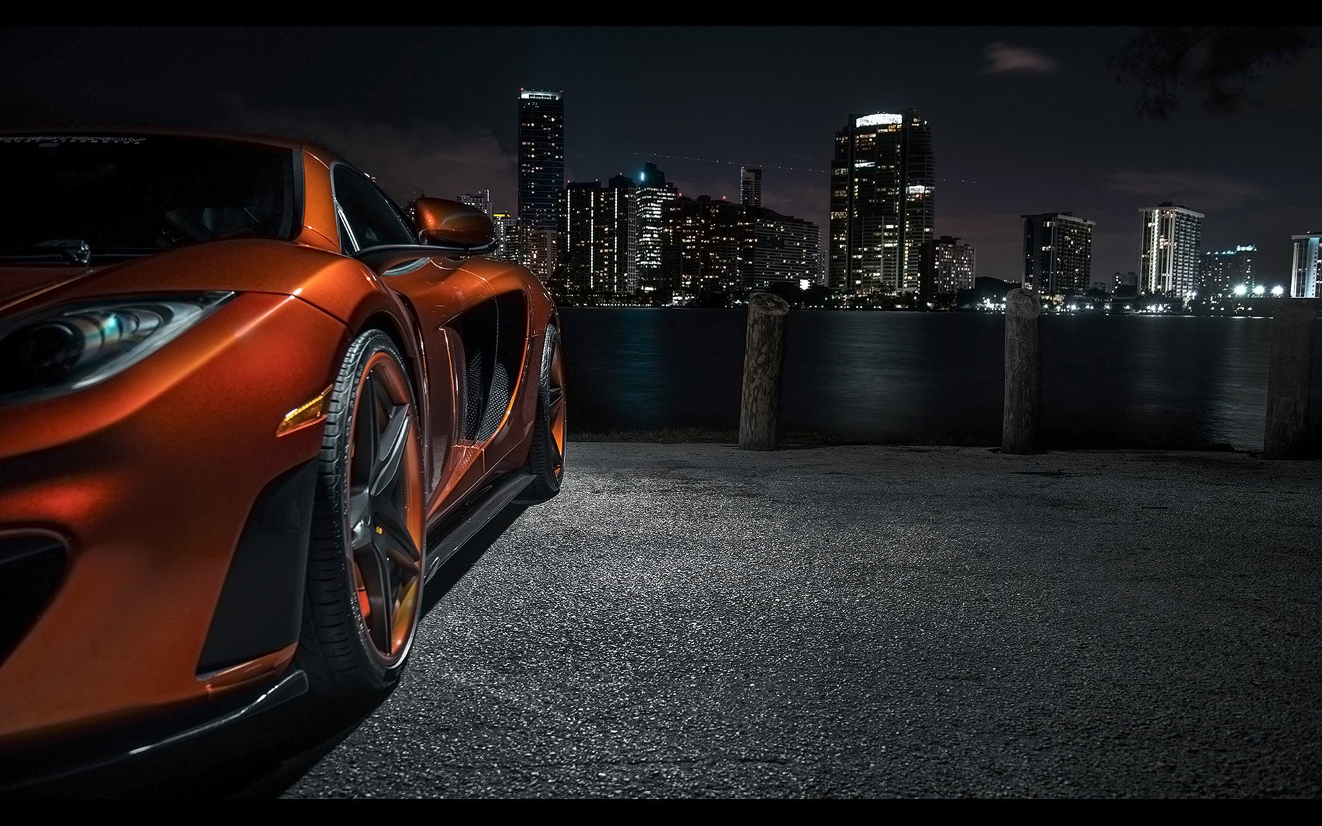 Description: A sports car parked in front of a city skyline at night with the lights on and the city lights in the background.