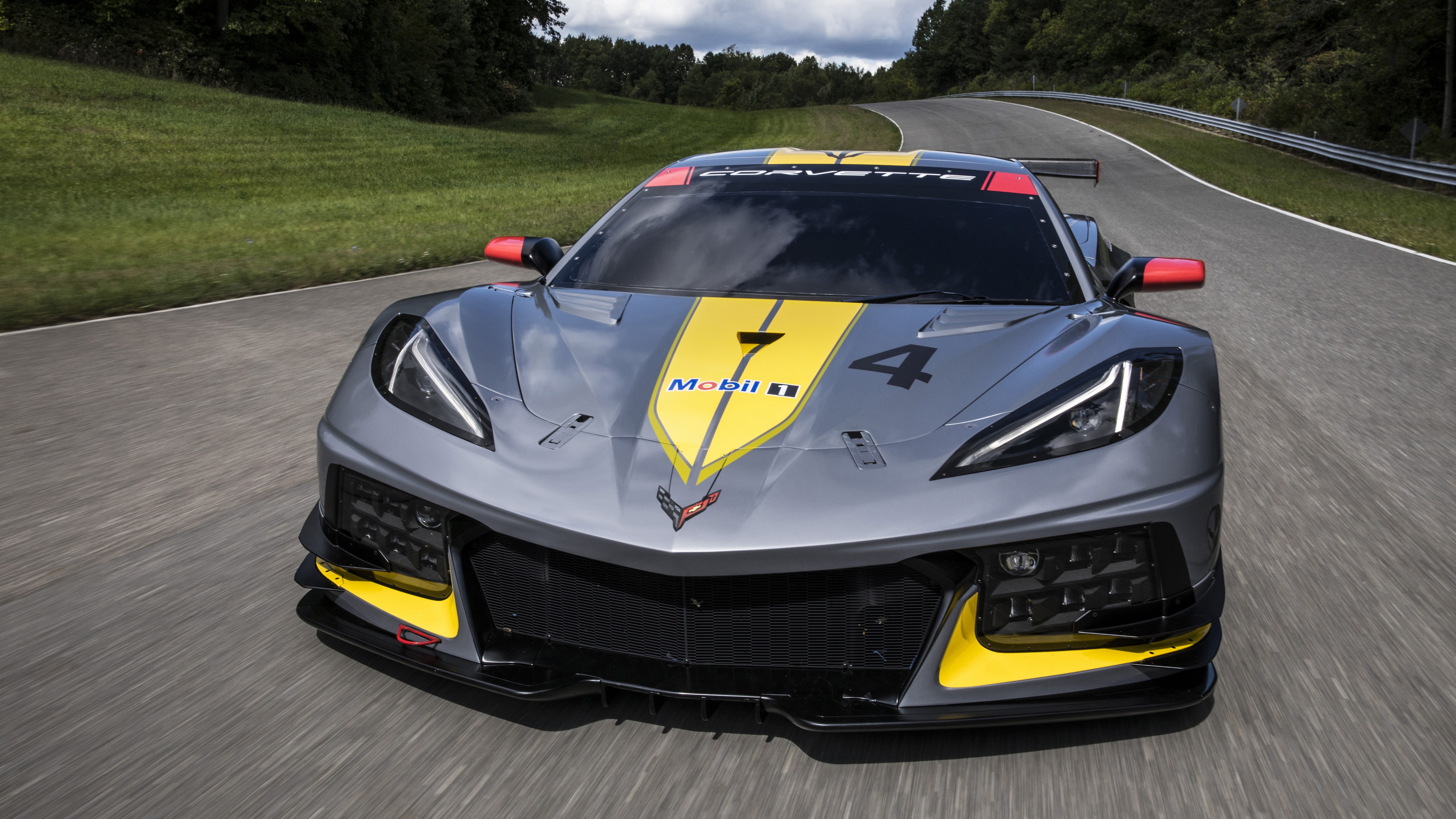 Description: A sports car driving down a road with trees in the background and a sky background with clouds in the sky.