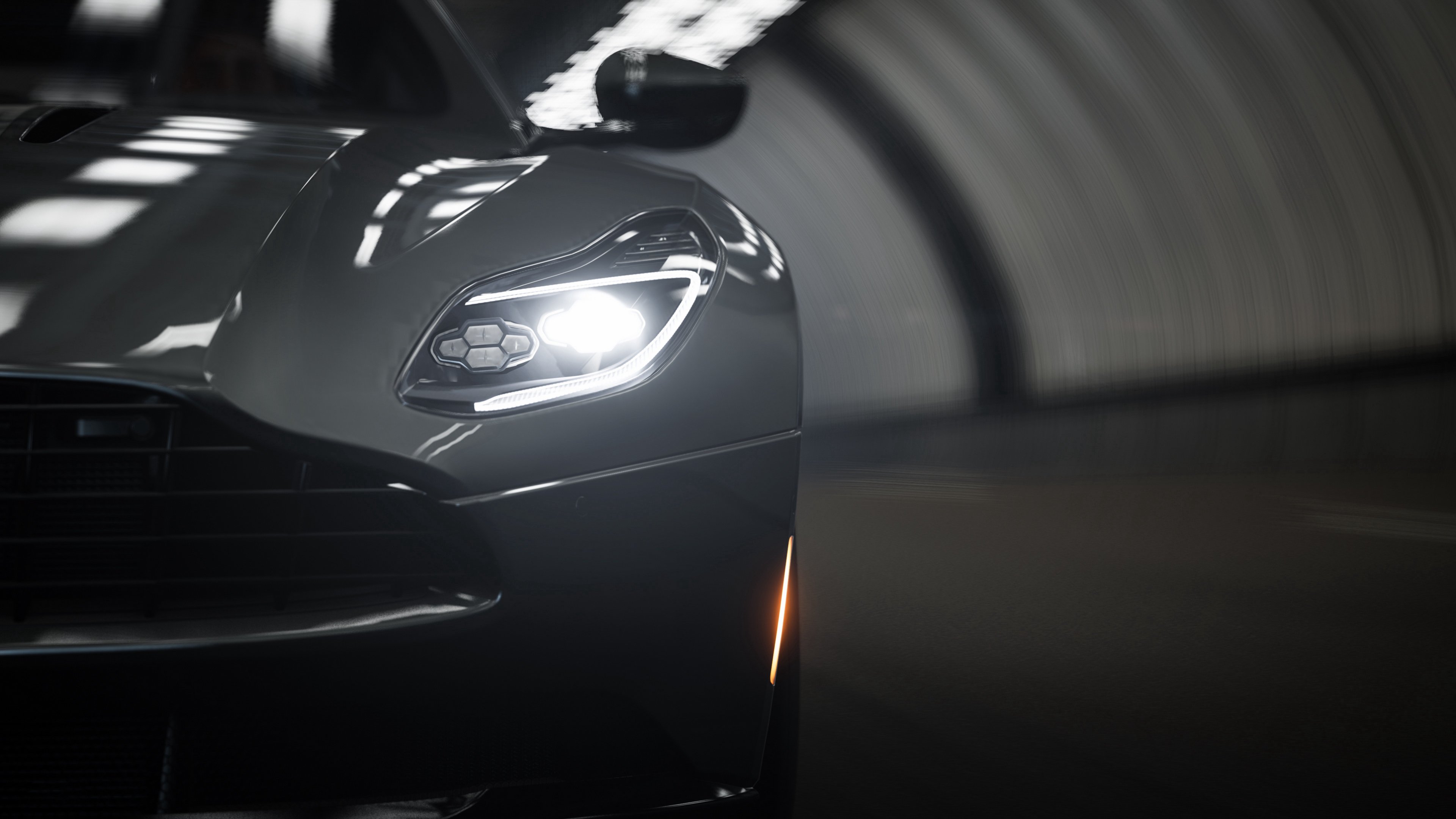 Description: A close up of a sports car in a tunnel with a light on it's headlight and a black background.