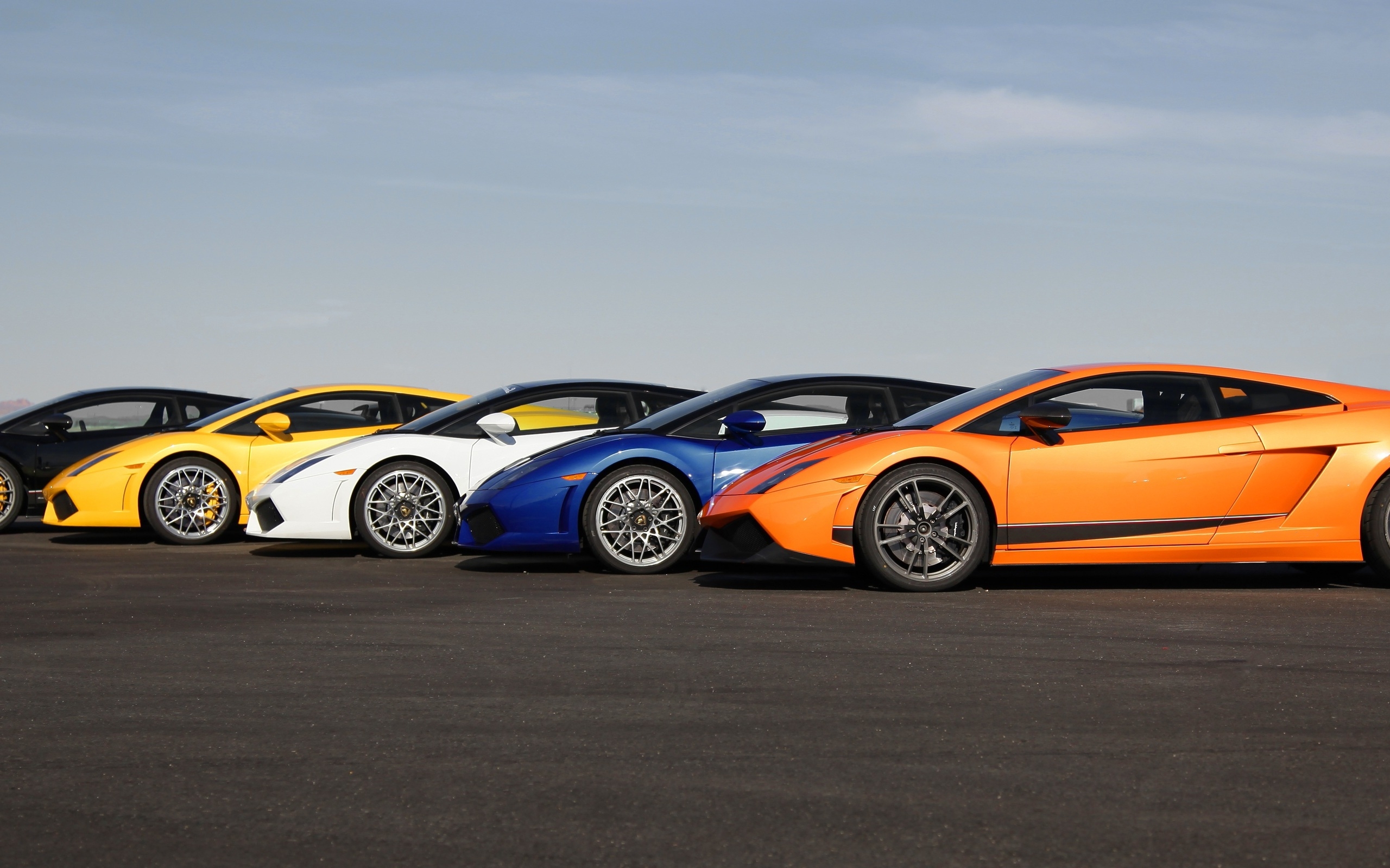 Description: A group of four sports cars parked in a parking lot next to each other on a cloudy day with a sky background.