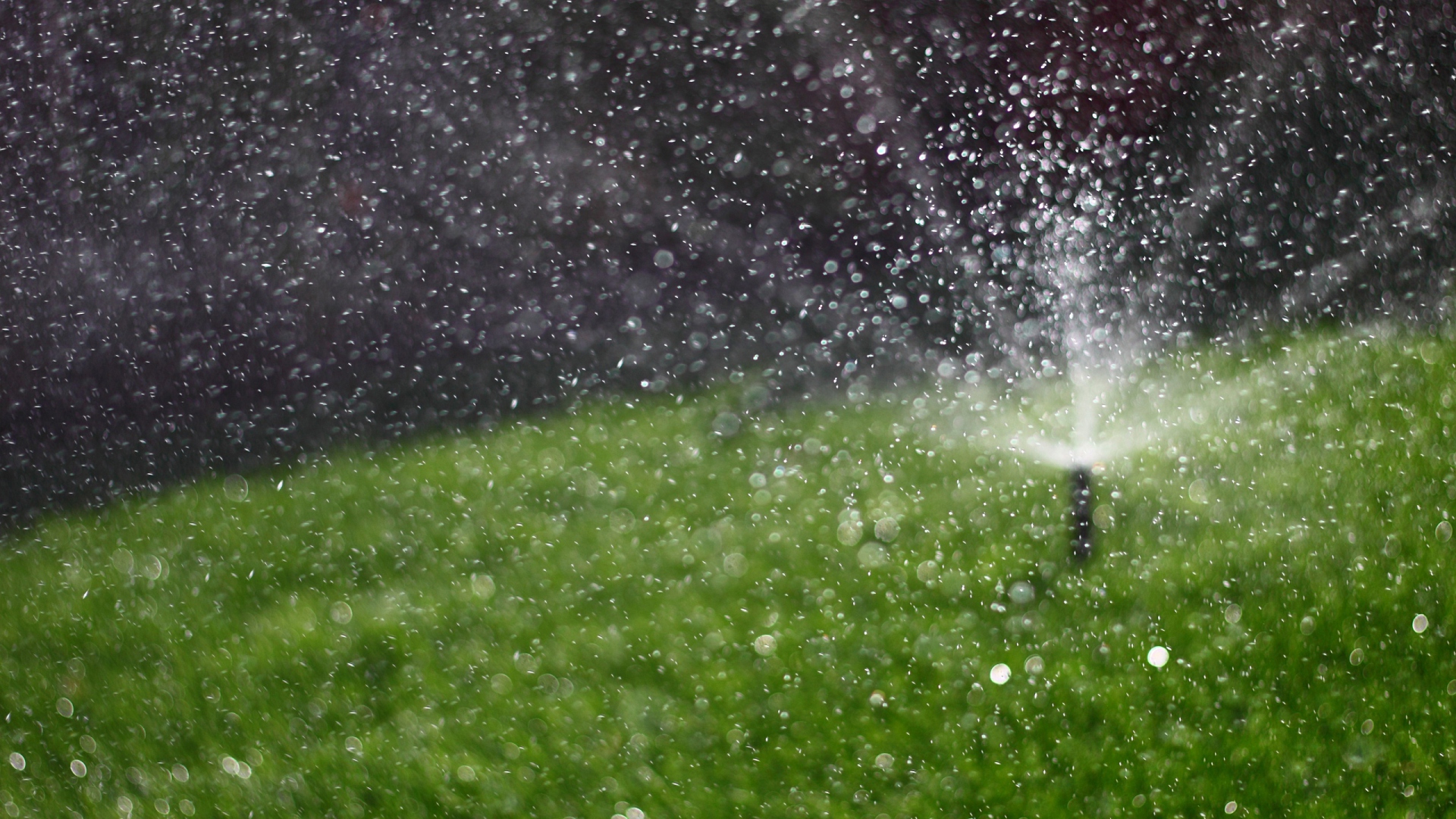 Description: A sprinkler spraying water on a green lawn in the rain with a red house in the background.