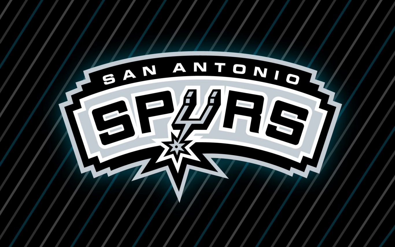 Description: The san antonio spurs logo on a black background with a blue and white stripe pattern and a black and white stripe.