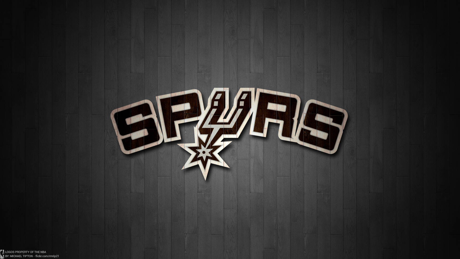 Description: The san antonio spurs logo on a wall in a dark room with wood paneling and a wooden floor.