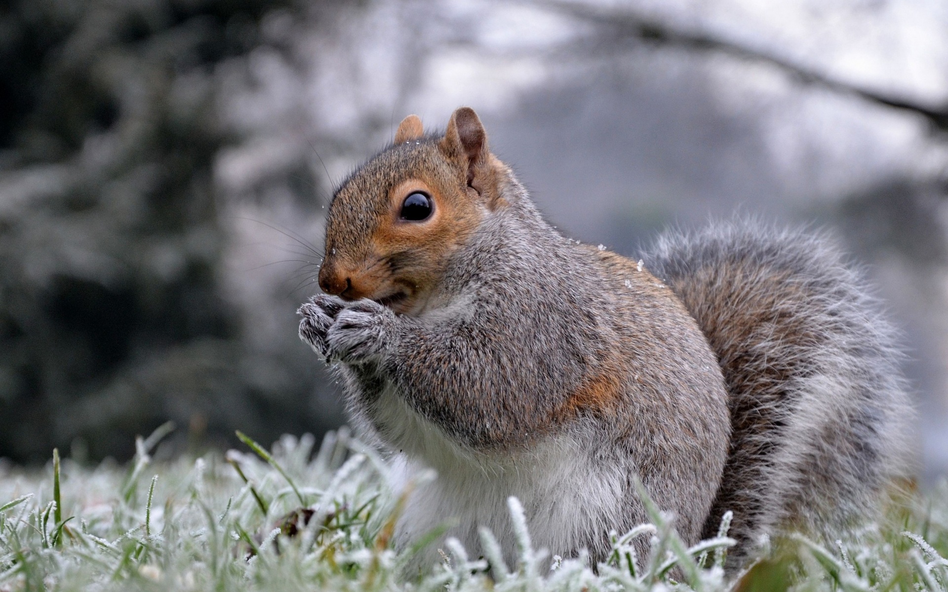 Description: A squirrel eating a piece of food in the grass with frost on it's fur and a tree in the background.