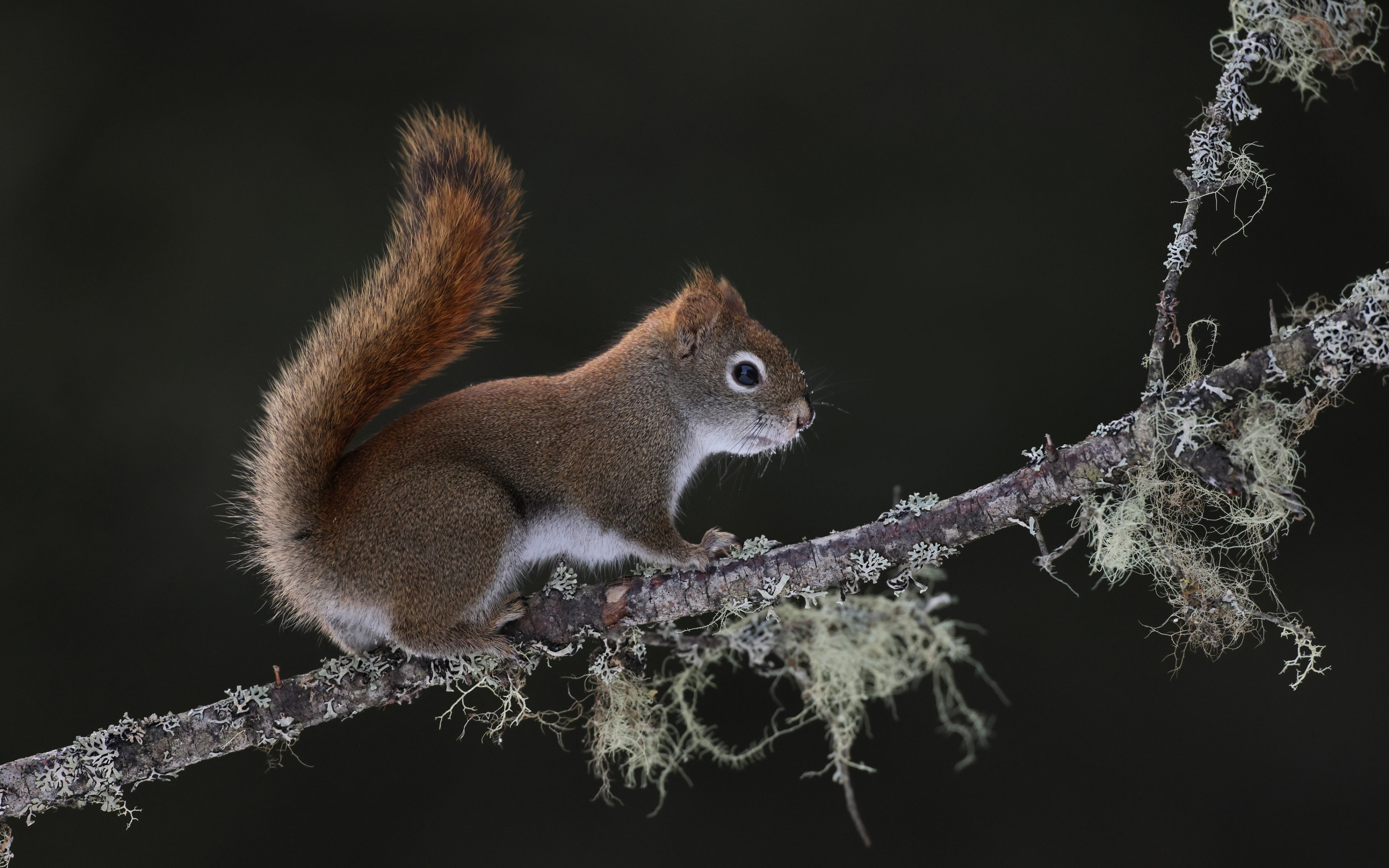 Description: A squirrel is sitting on a branch with moss on it's back legs and a black background behind it.