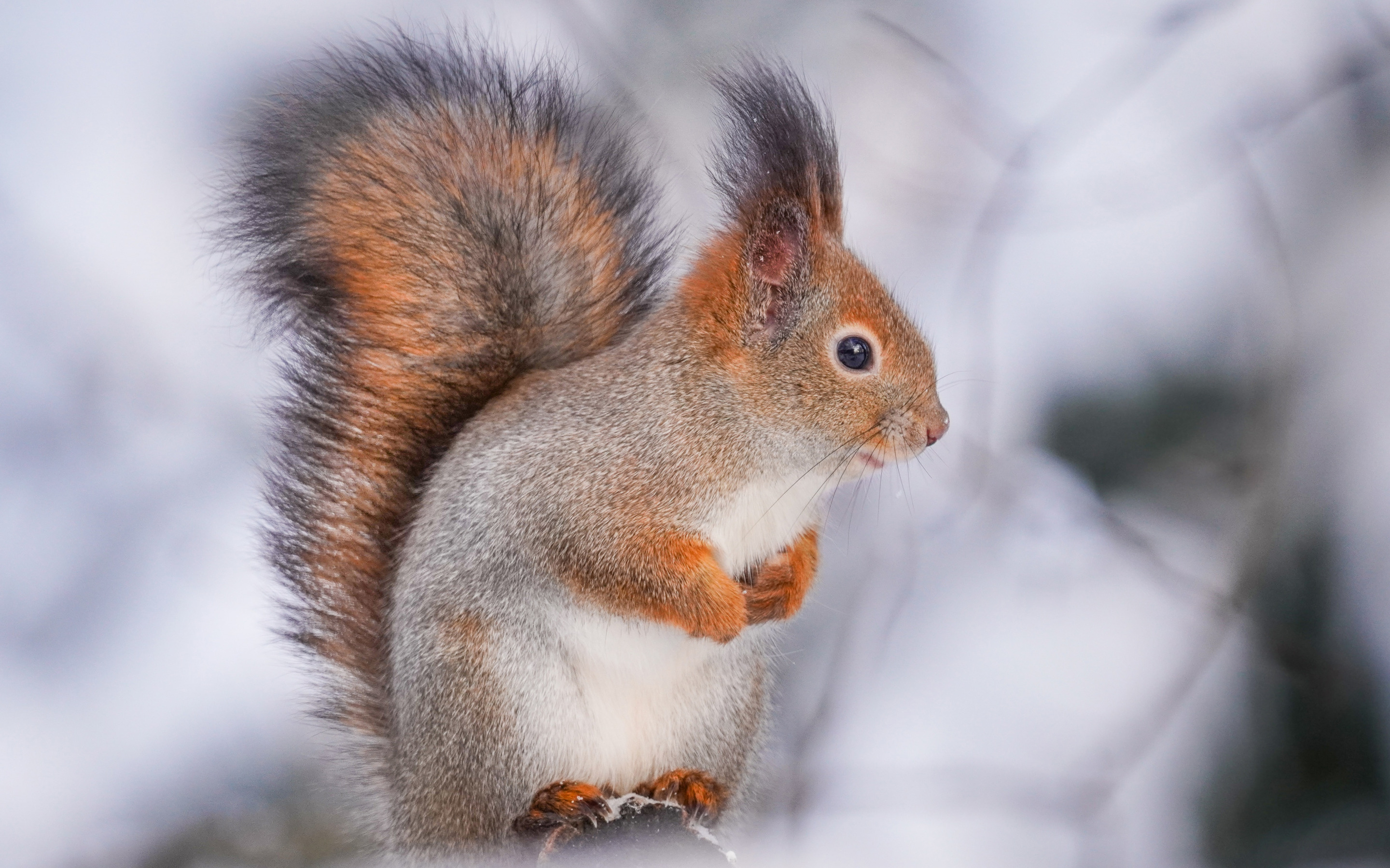Description: A squirrel is sitting on a branch in the snow and looking at the camera with a curious look on its face.