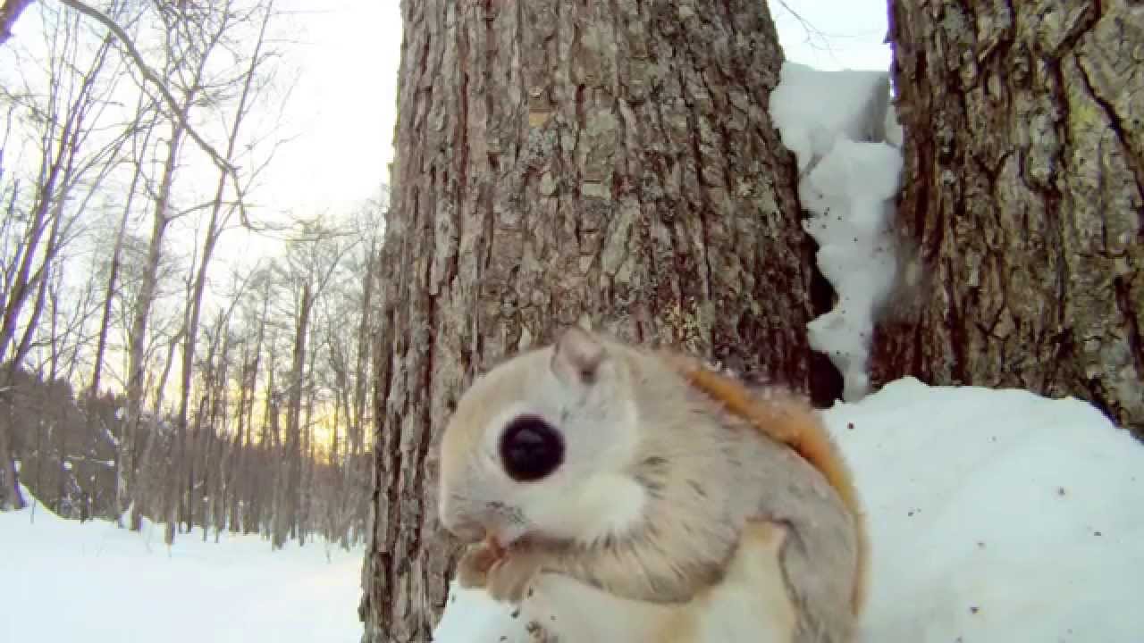 Description: A squirrel is standing in the snow near a tree trunk and a tree trunk with snow on it and a squirrel is looking at the camera.
