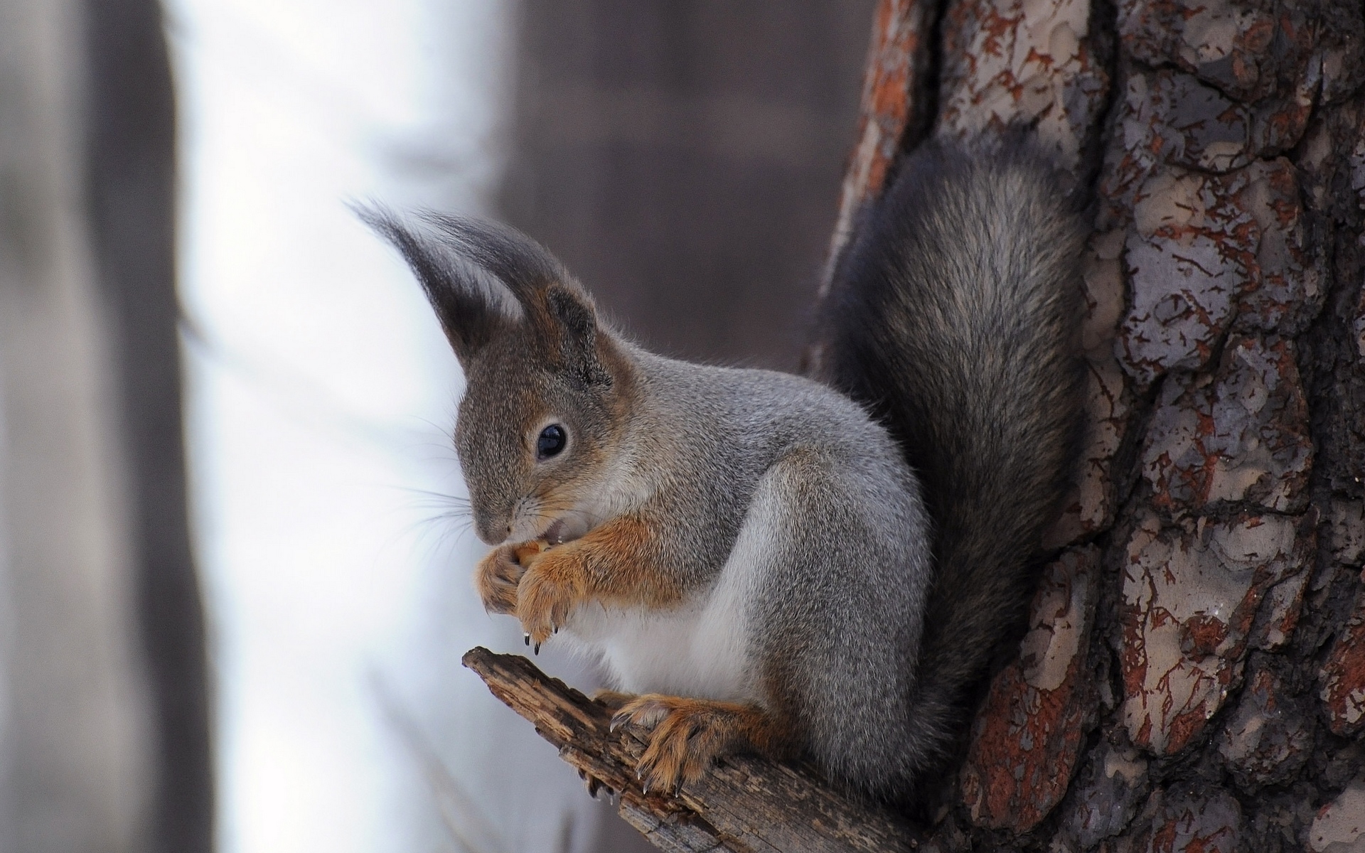 Description: A squirrel is sitting on a tree branch eating a nut in the woods in winter time.