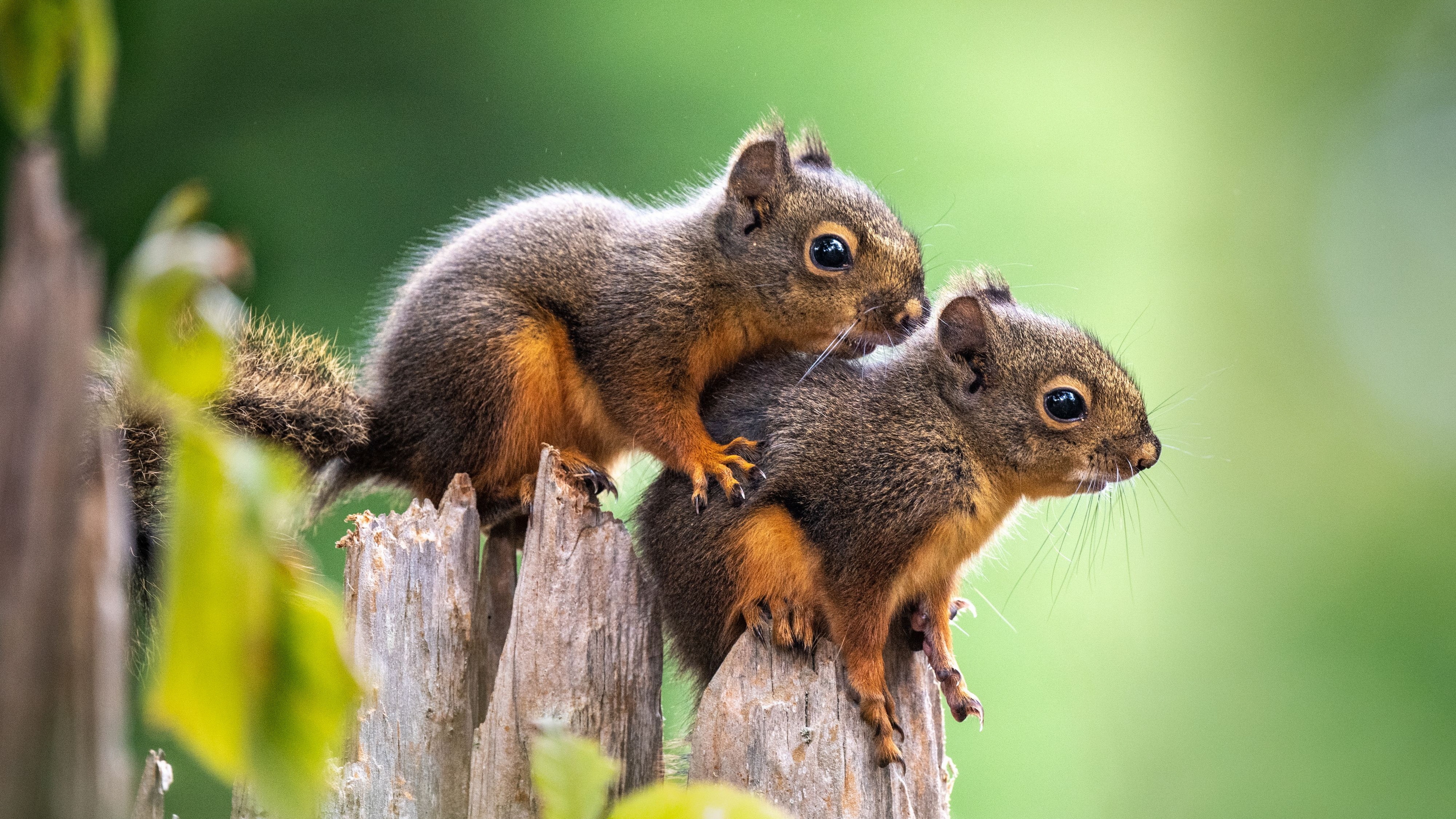 Description: Two squirrels sitting on top of a wooden post together.