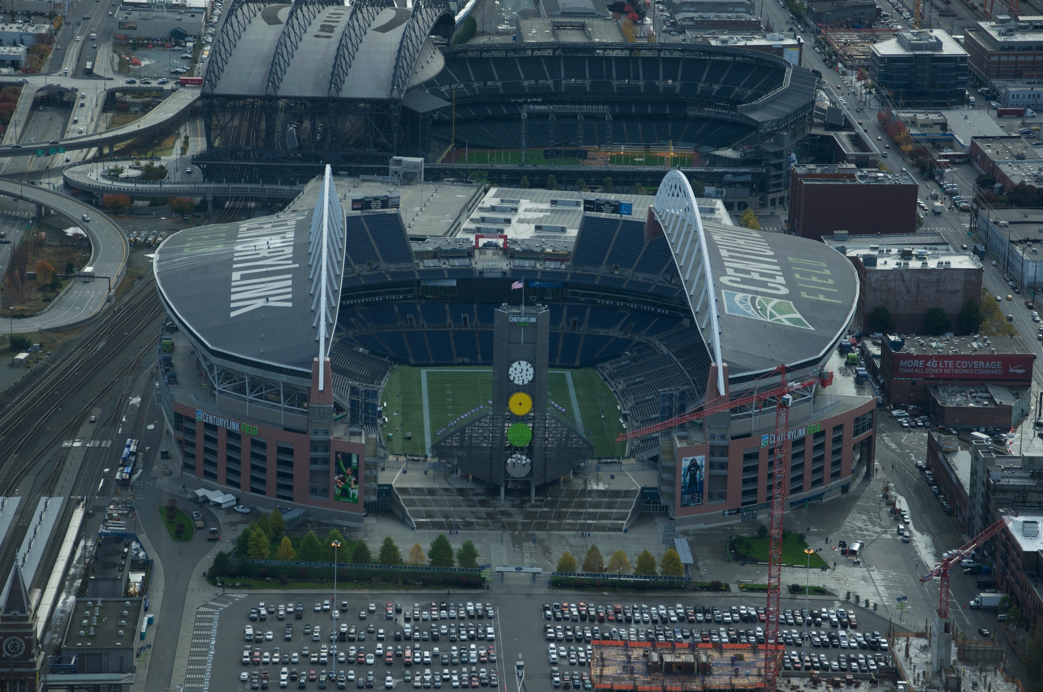 Description: A stadium with a lot of cars parked in it and a clock tower in the middle of the center.