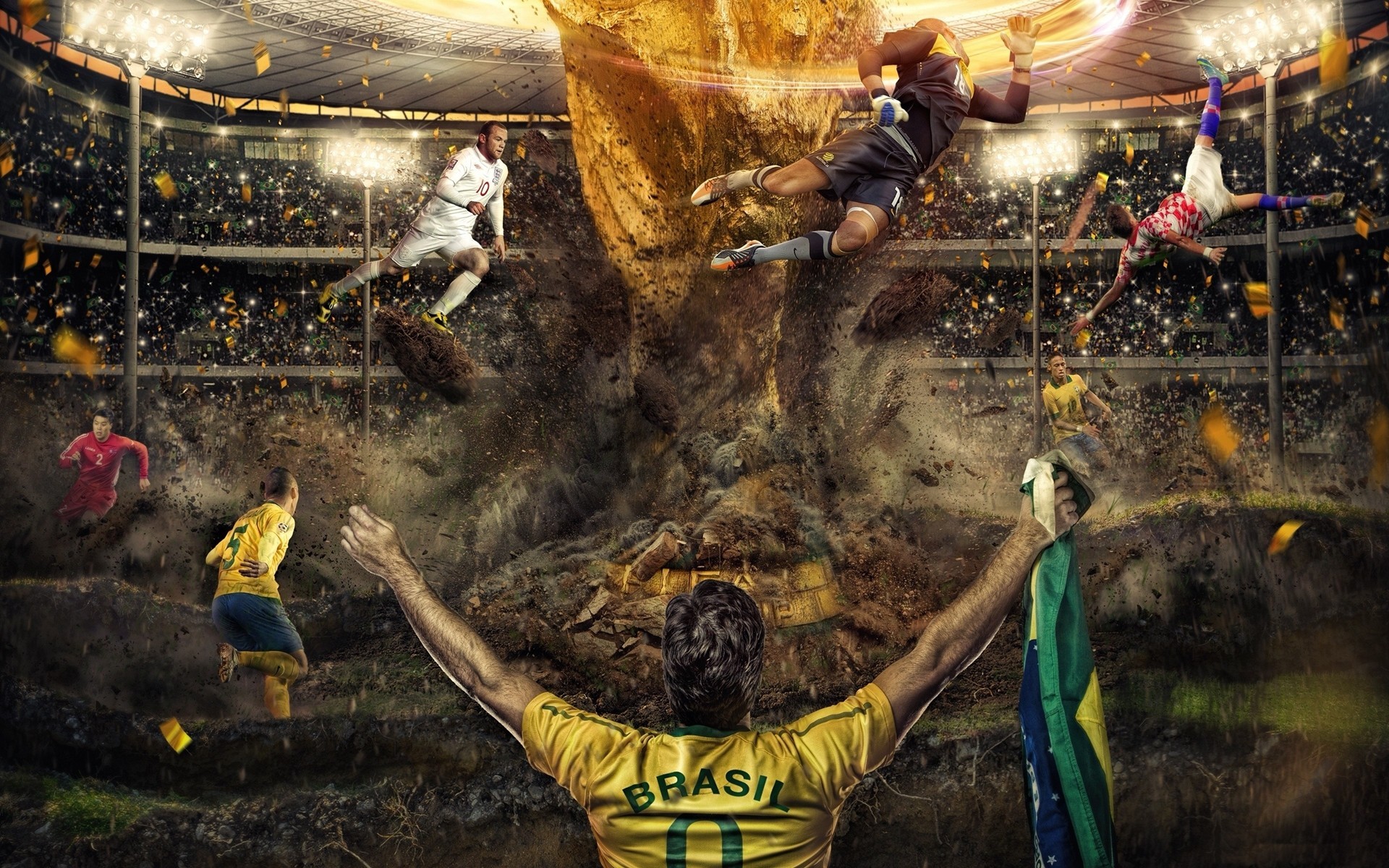 Description: A man is standing in a stadium with his arms up in the air as other people run around him.
