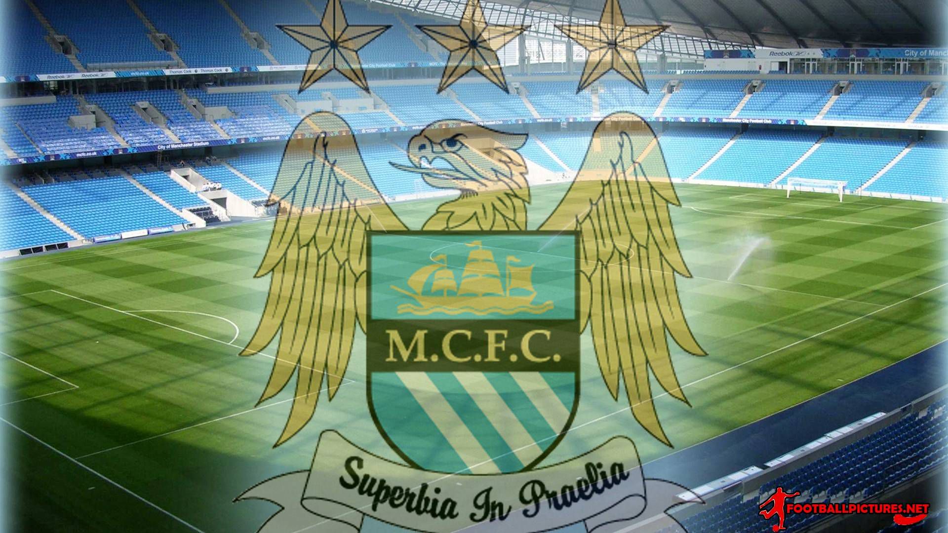 Description: A stadium with a large emblem on it's side wall and a soccer field with stars in the background.