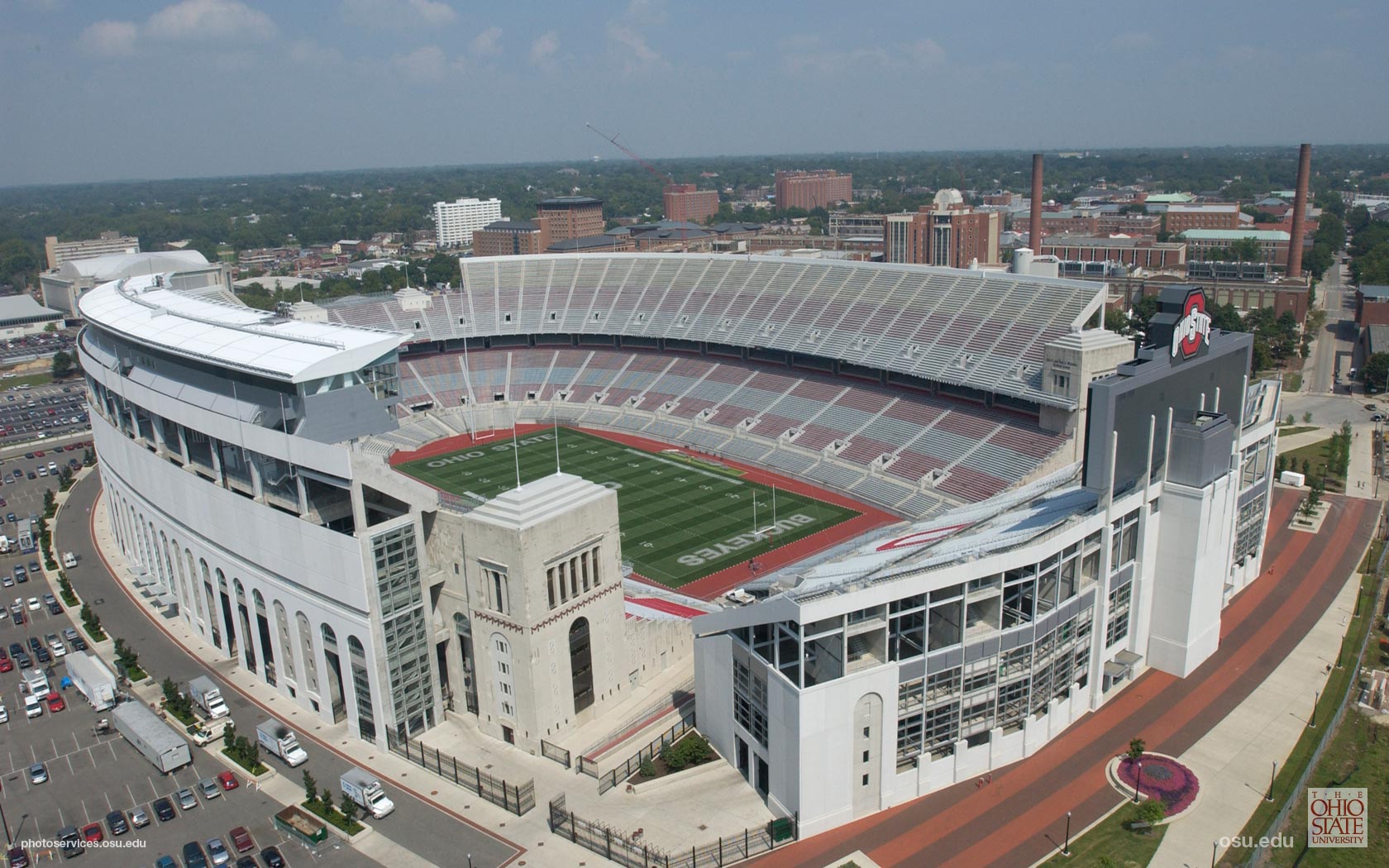 Description: A stadium with a field and a large building in the background with cars parked in front of it and a few buildings around it.