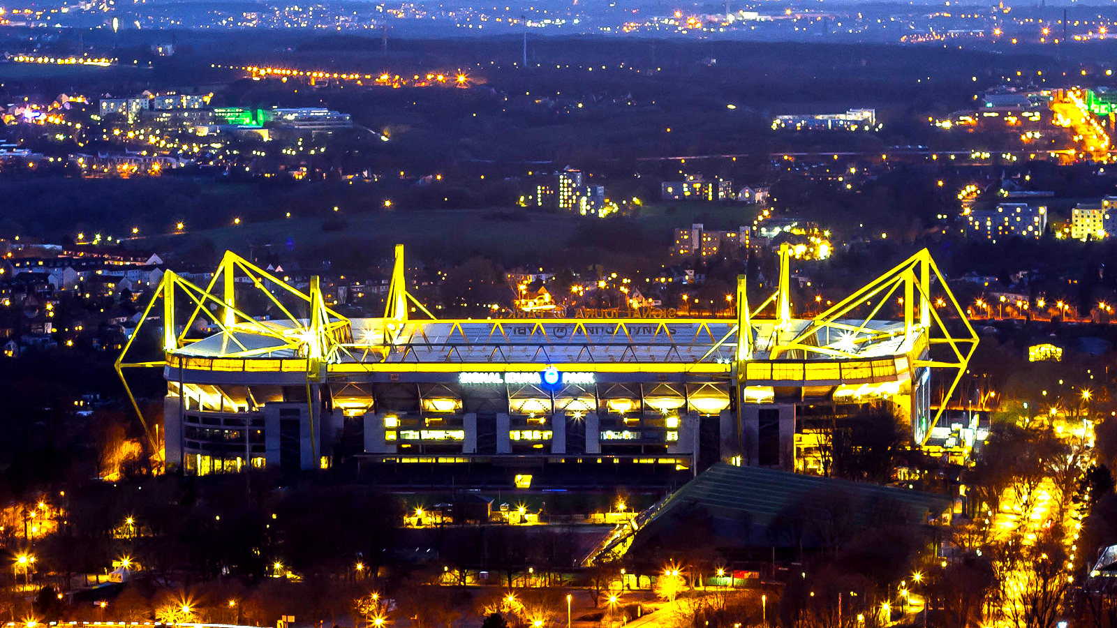 Description: A stadium lit up at night with lights on it's sides and a stadium in the background with a lot of lights on the ground.