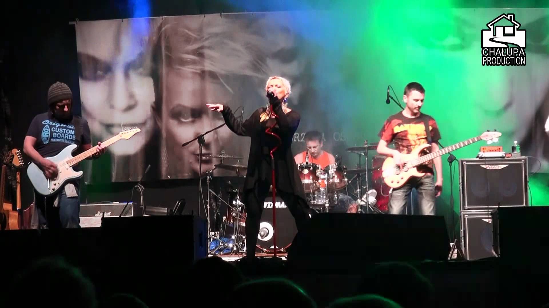 Description: A group of people on stage with guitars and a microphone in front of them and a poster behind them.