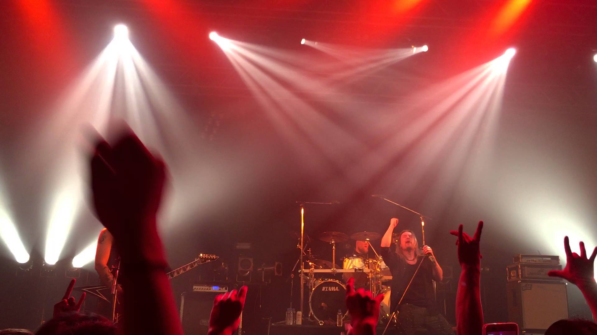 Description: A group of people on stage with their hands up in the air and lights on the stage behind them.