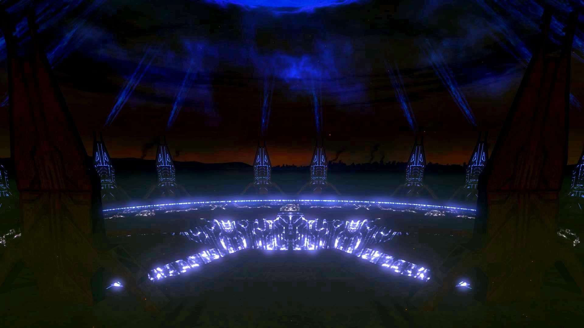 Description: A stage with lights and a lot of people on it at night time with a sky background and a blue sky.