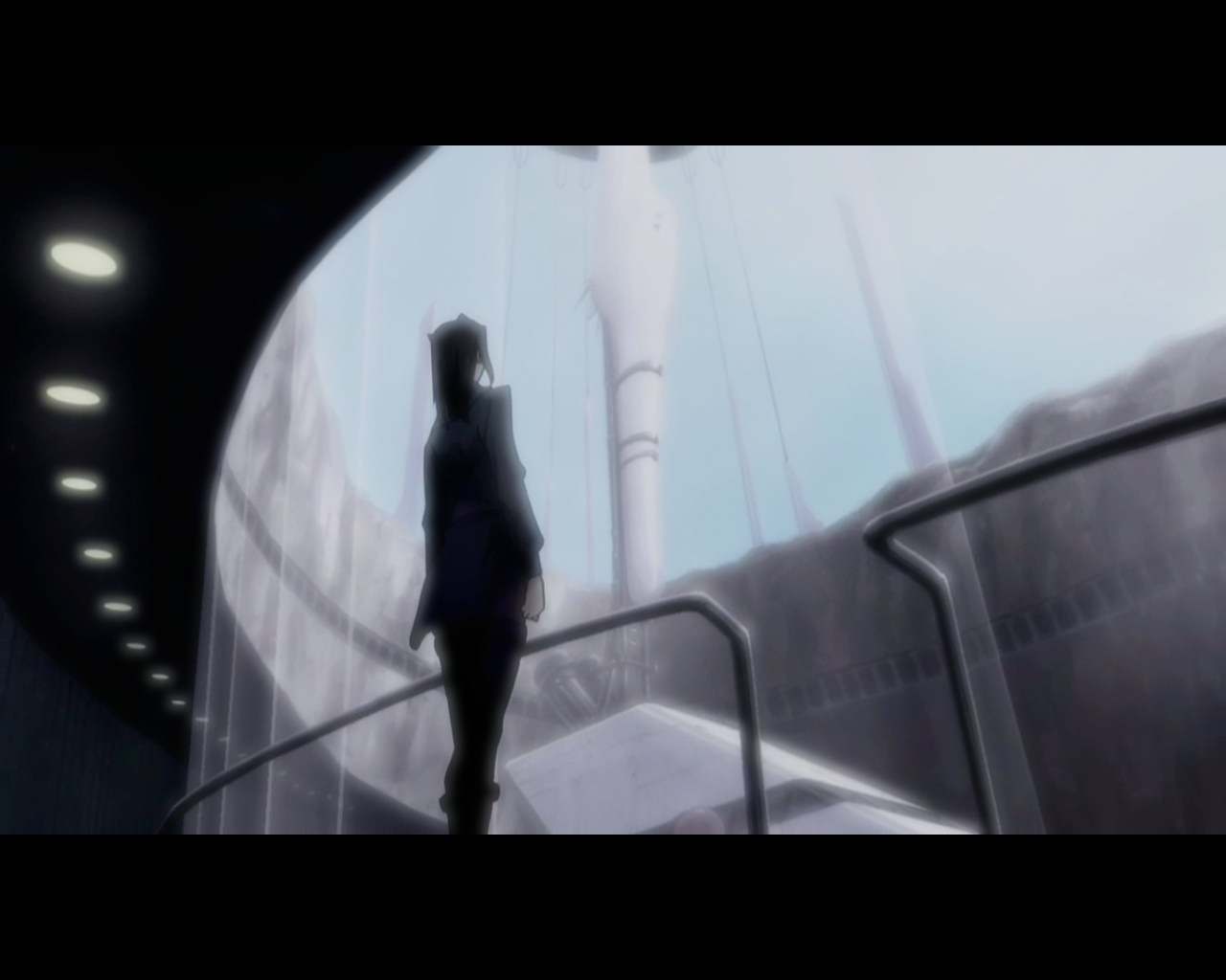 Description: A person walking up a set of stairs in a building with a sky background and a circular window above them.