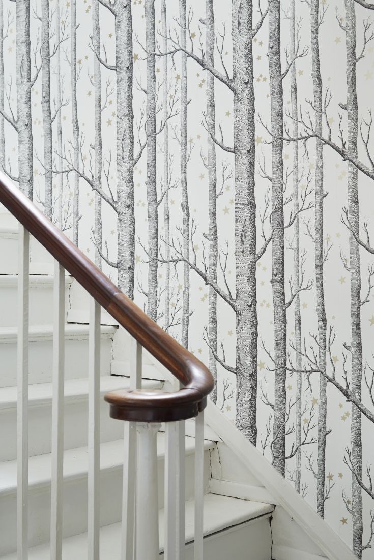 Description: A stair case with a wallpapered wall and a banister with a handrail and a handrail.