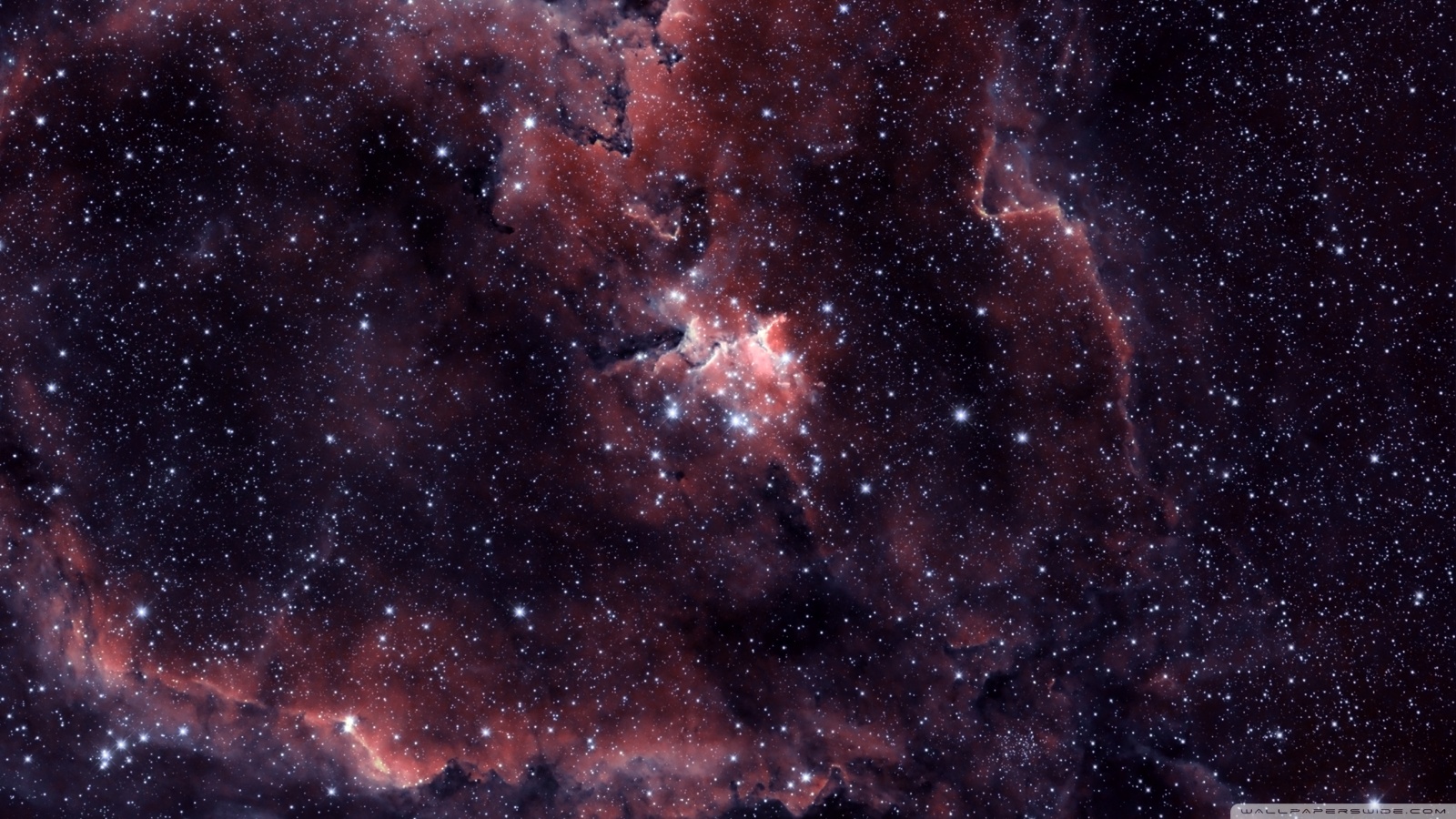 Description: A star forming region in the sky with stars all around it and a red star in the center of the picture.