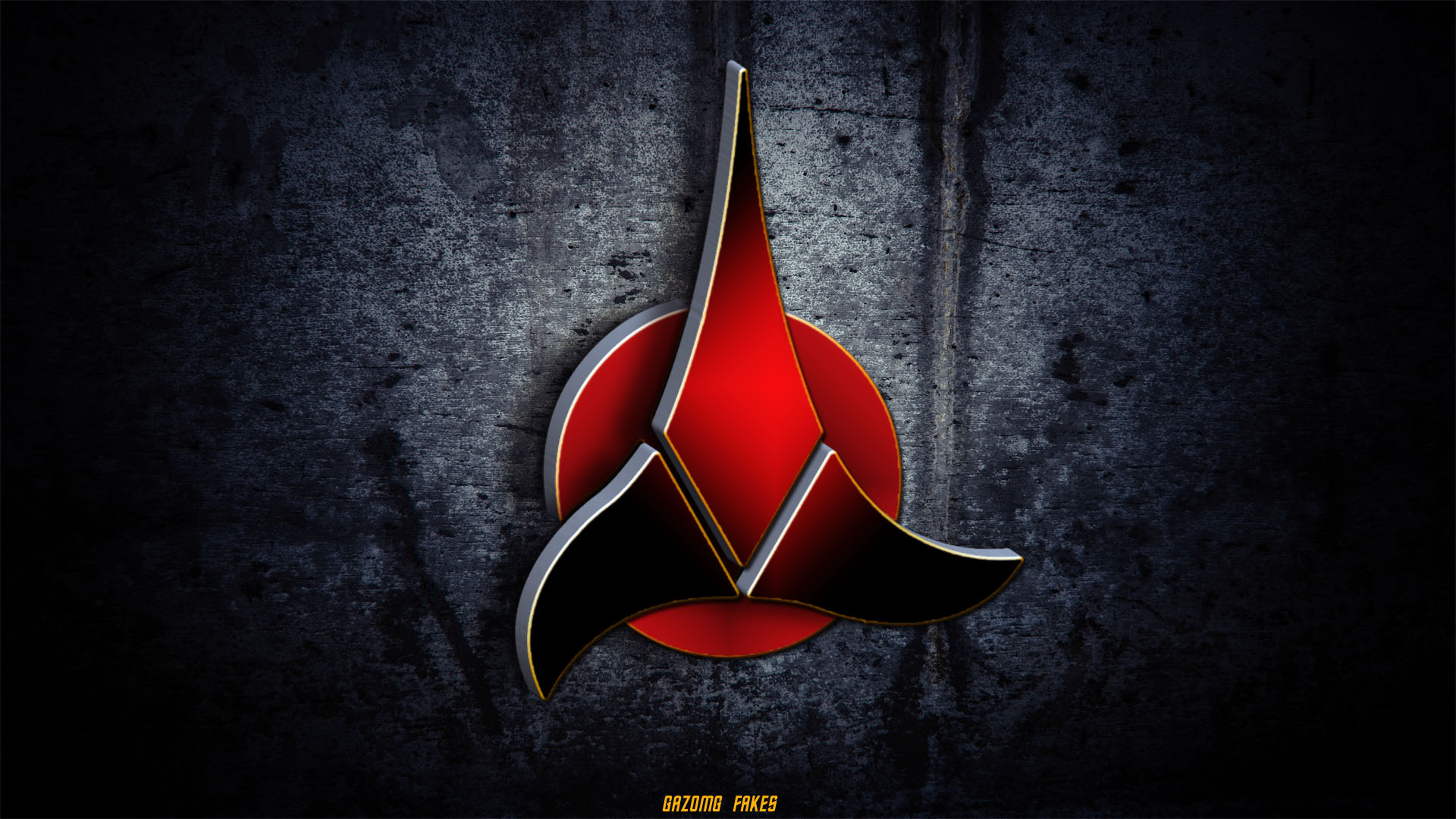 Description: A star trek emblem on a dark background with a red and black background and a yellow stripe on the bottom of the star trek logo.