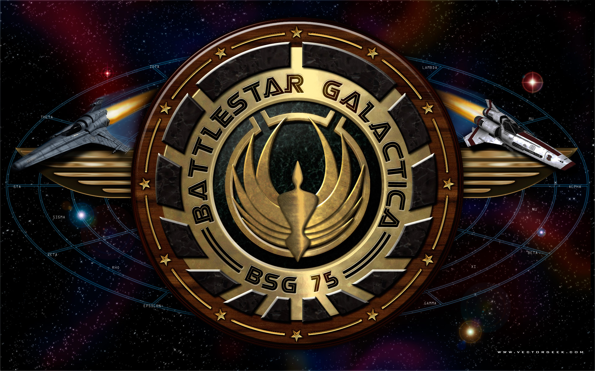 Description: A star trek logo with a space shuttle in the background and a star trek insignia in the middle of the image.