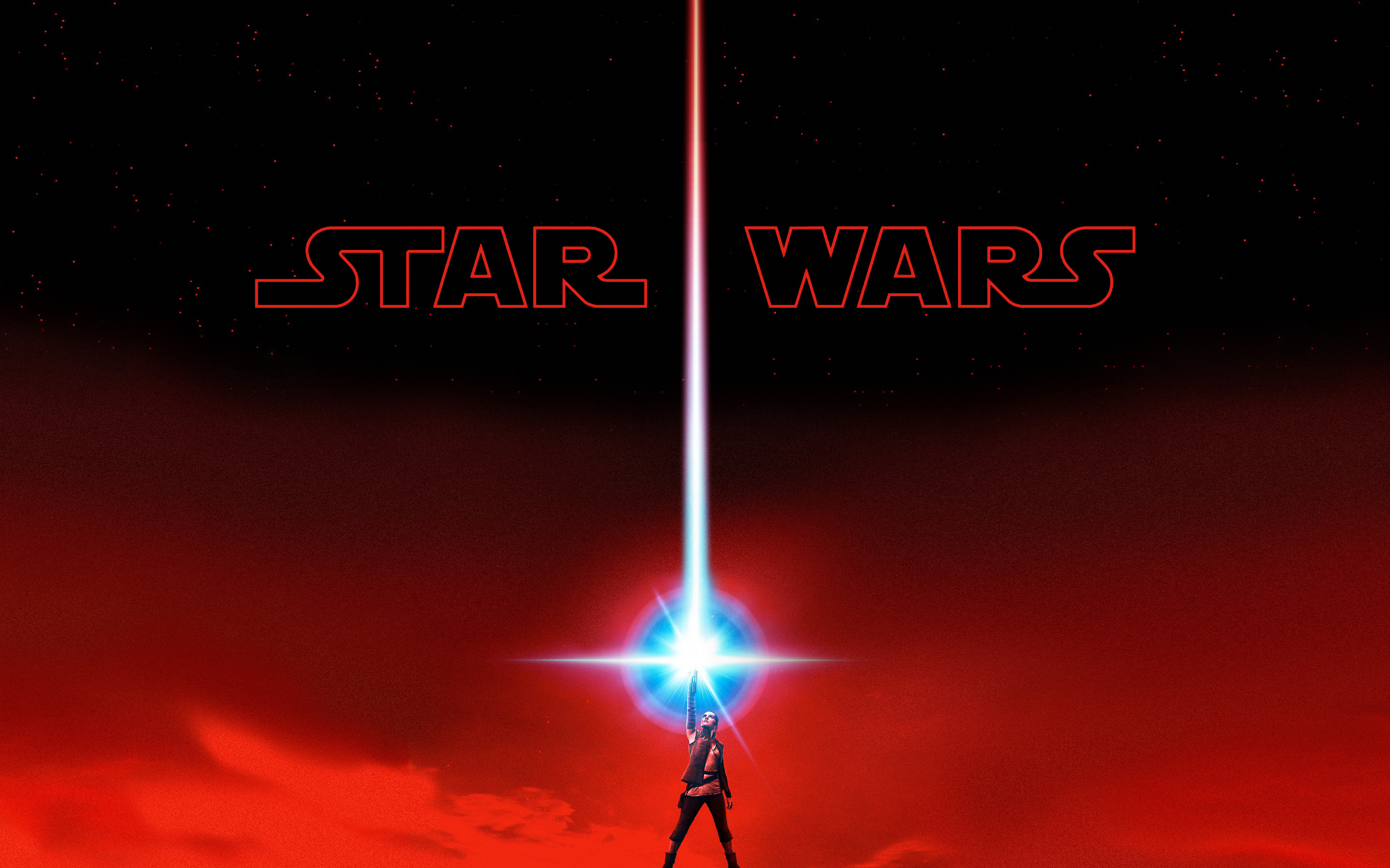 Description: A poster of a person holding a light saber in the sky with a red background and a star wars logo.