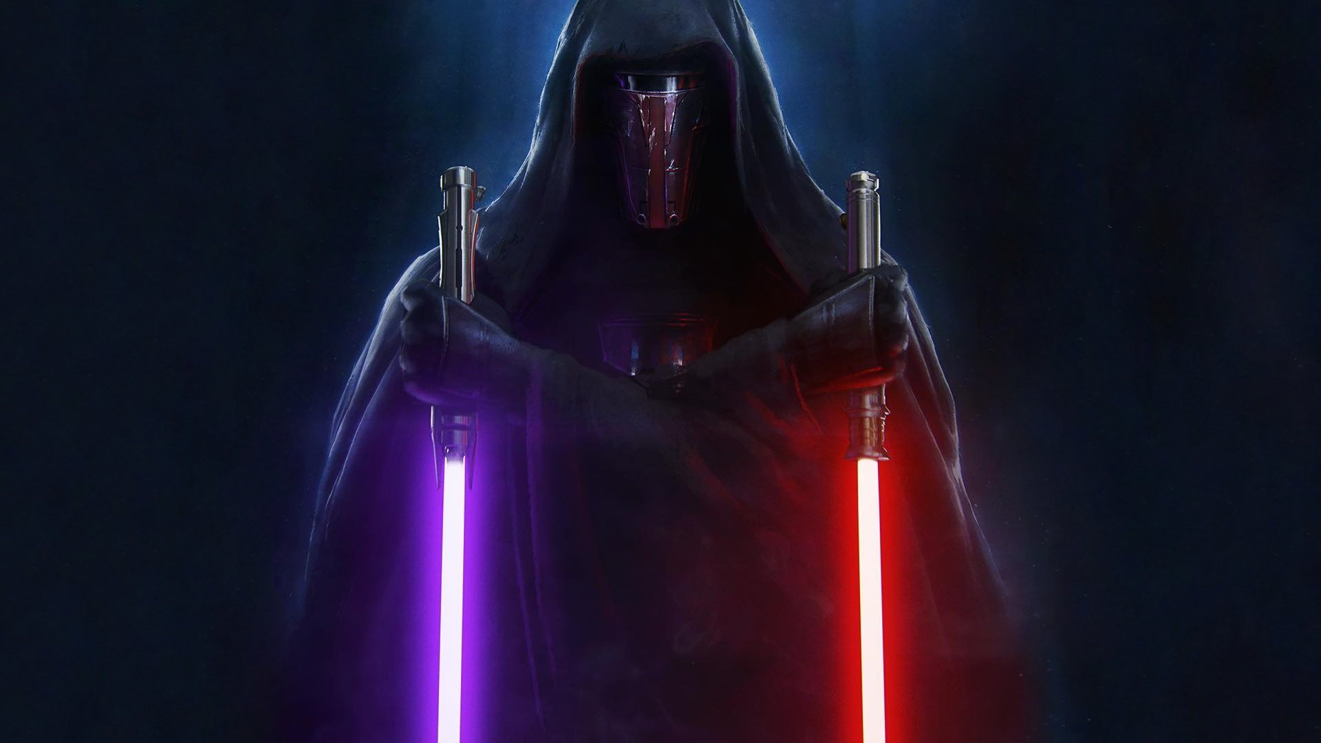 Description: A star wars character holding two lightsabes in their hands and a dark background with a light beam.