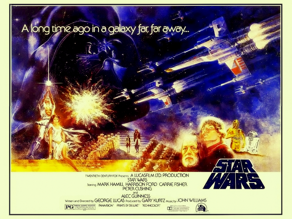 Description: A movie poster for star wars with a man and a woman in front of a spaceship and a man in the background.
