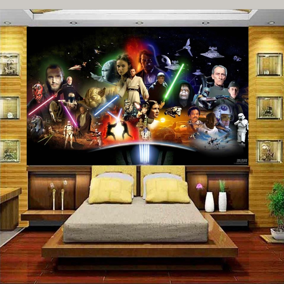 Description: A bedroom with a large star wars mural on the wall and a bed in front of it with a wooden headboard.