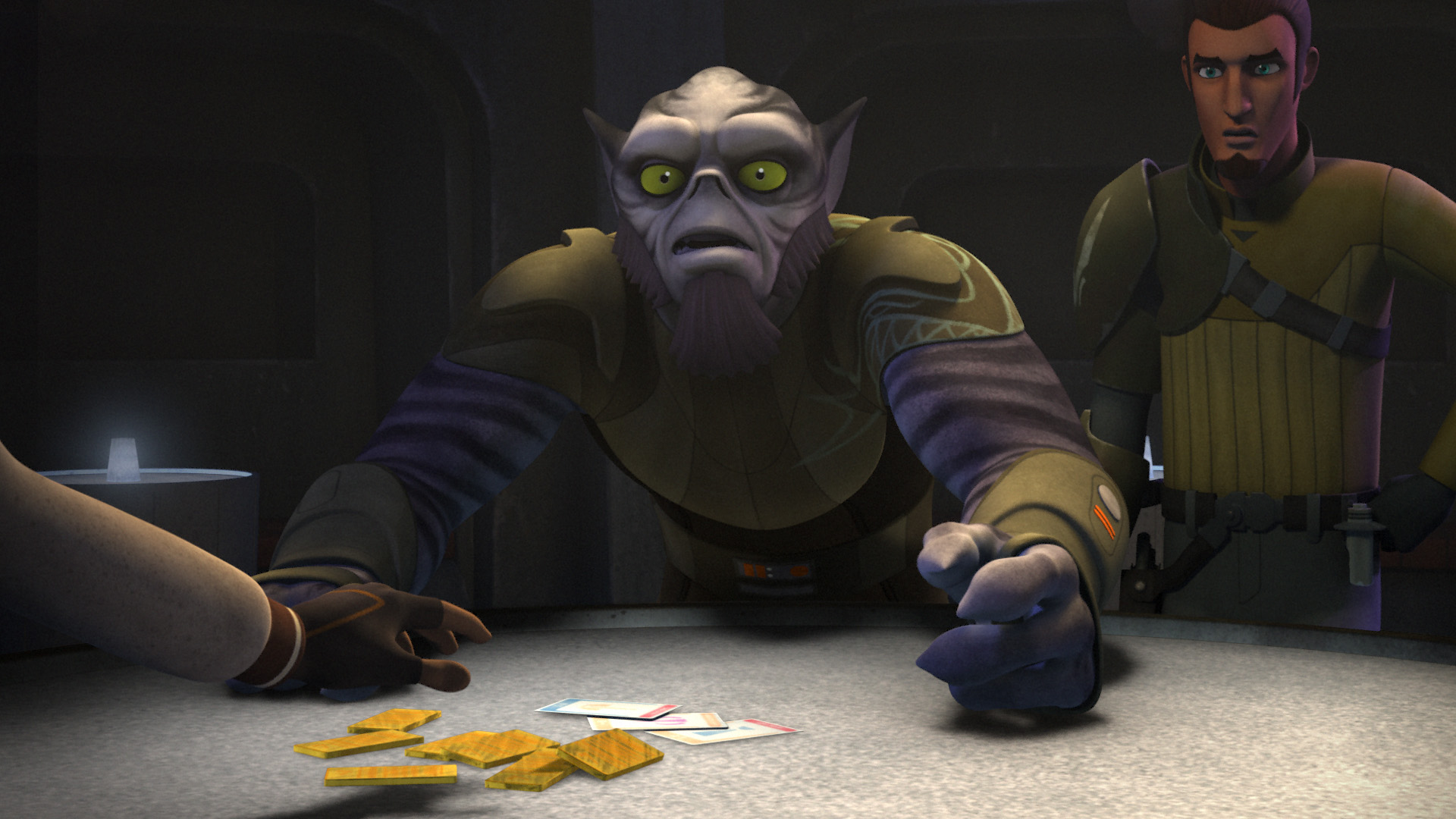 Description: A scene from star wars the old republic with a man and a woman playing a game of dice and chips.