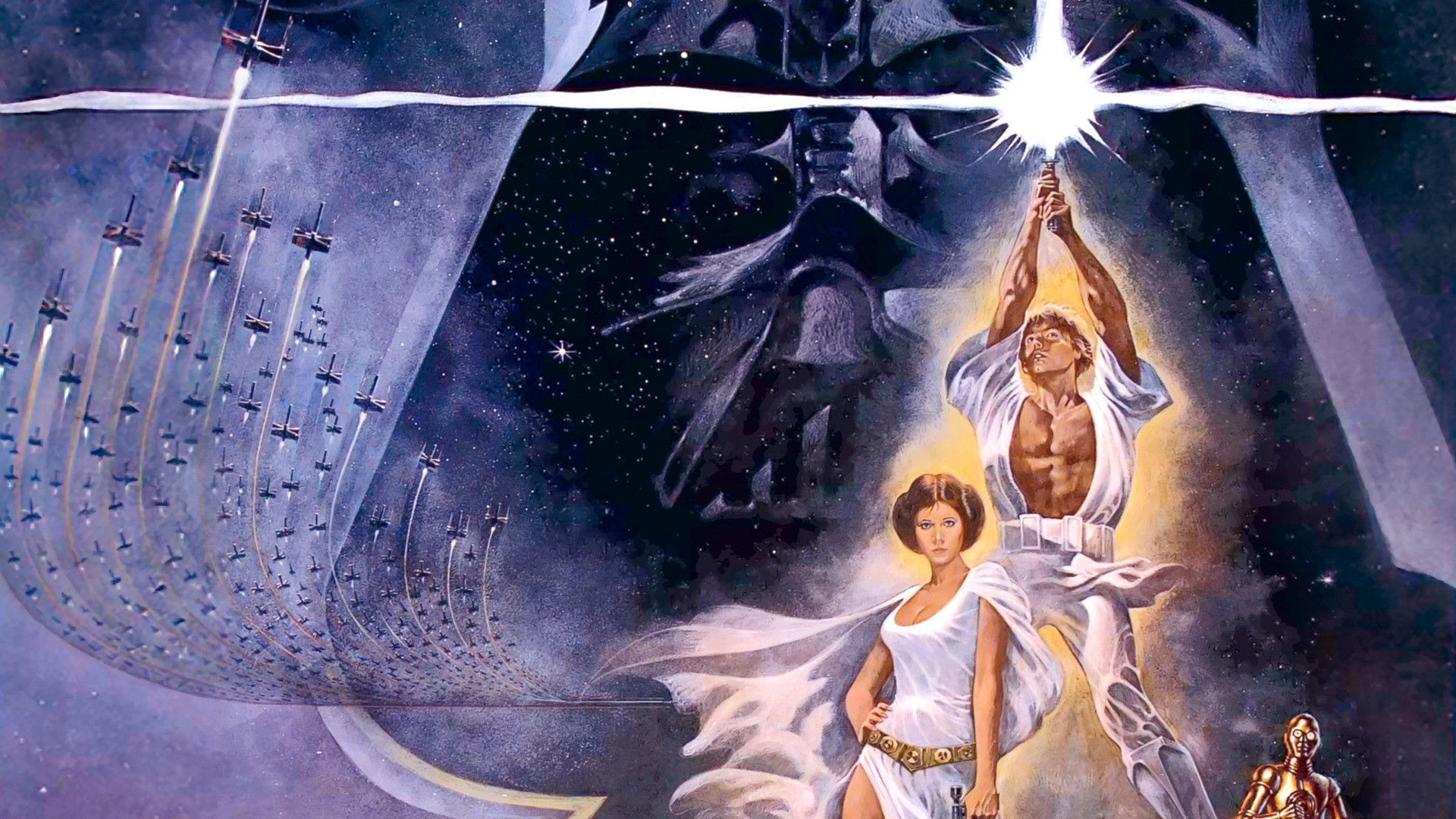 Description: A painting of a man and a woman in front of a star wars scene with a light saber and a giant ship.