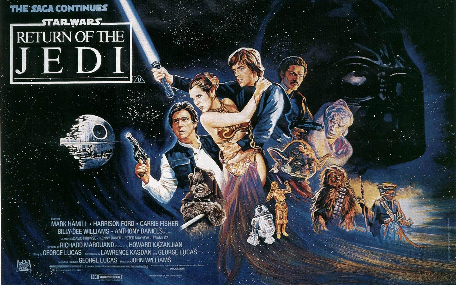 Description: A movie poster for star wars return of the jedi with characters from the film star wars and a dark side.