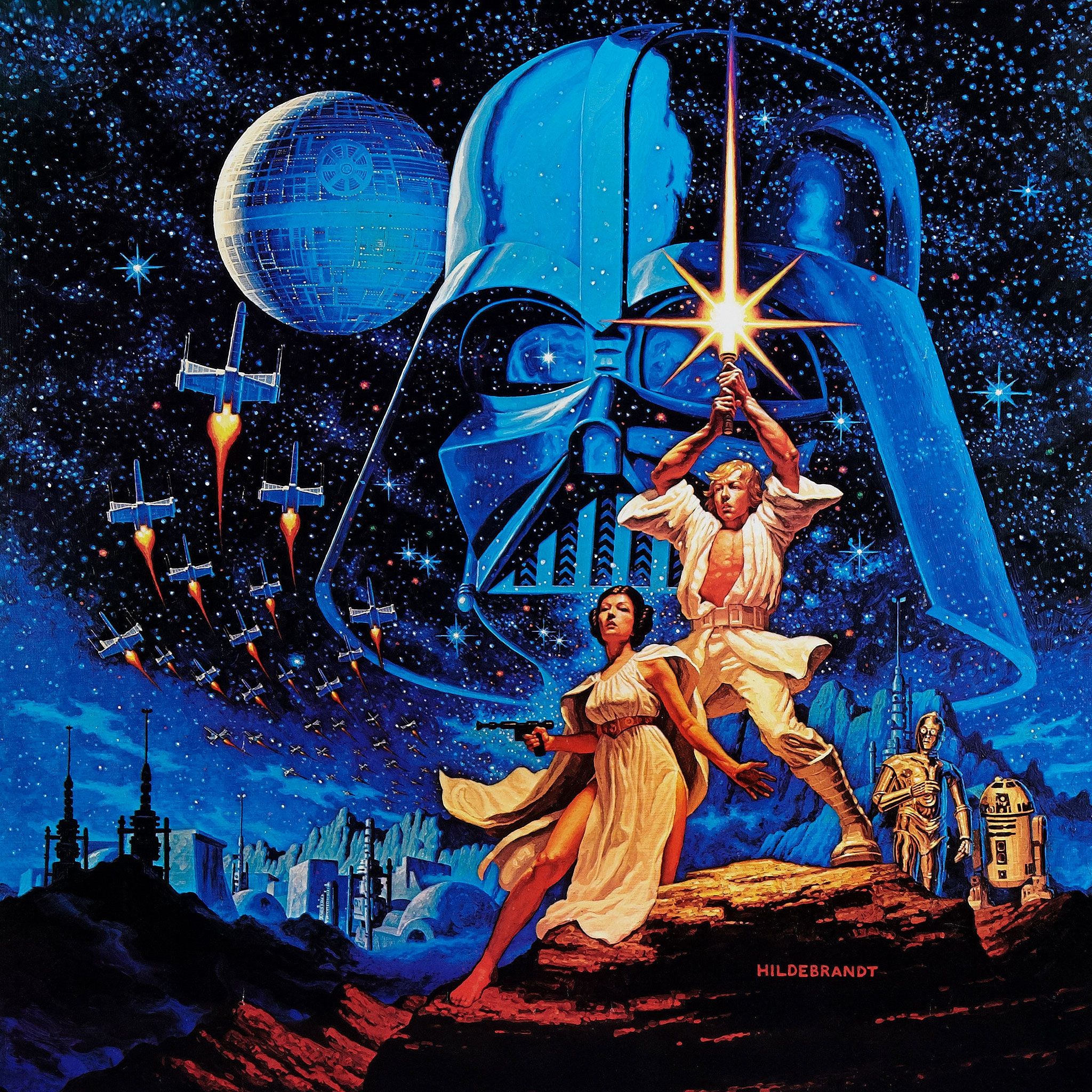 Description: A painting of a star wars scene with a man and woman holding a sword and a man in a helmet.