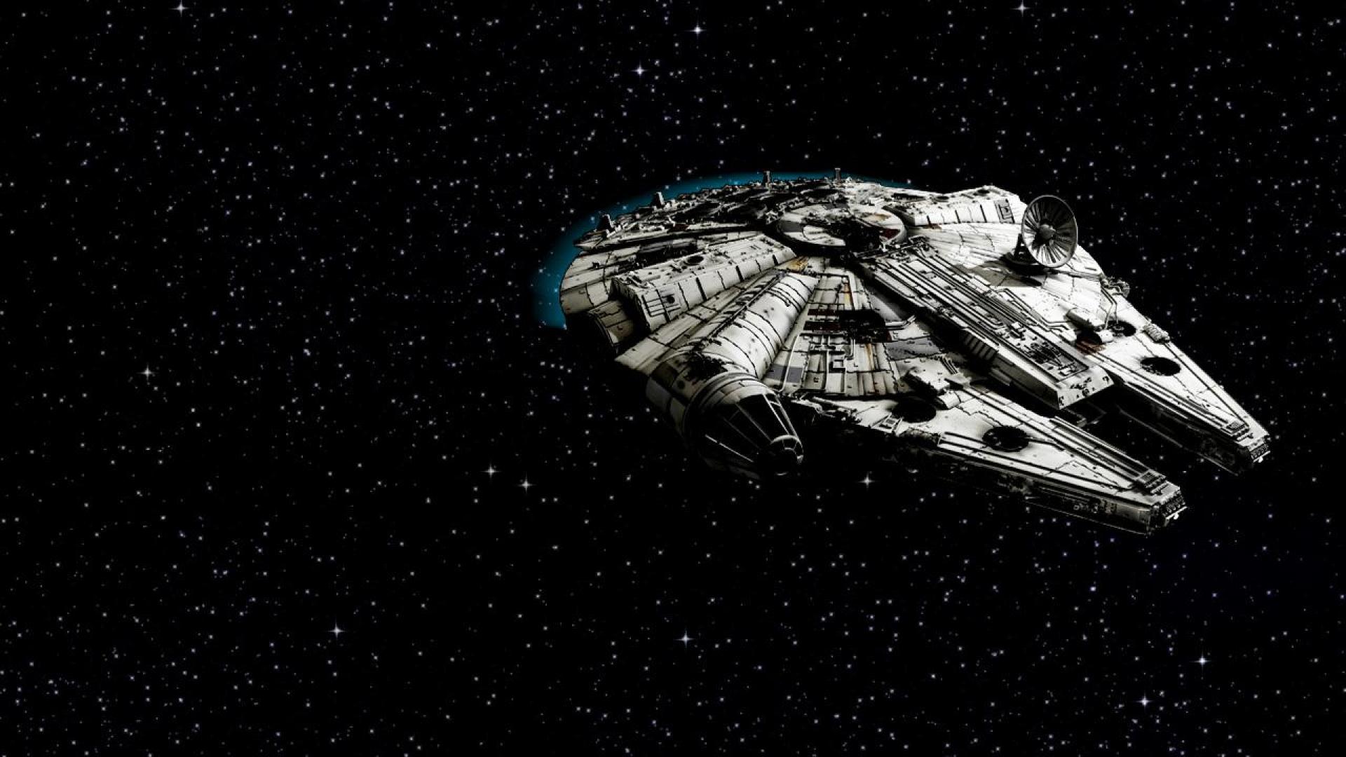 Description: A star wars ship in the dark of night with stars in the background and a blue light on the side.