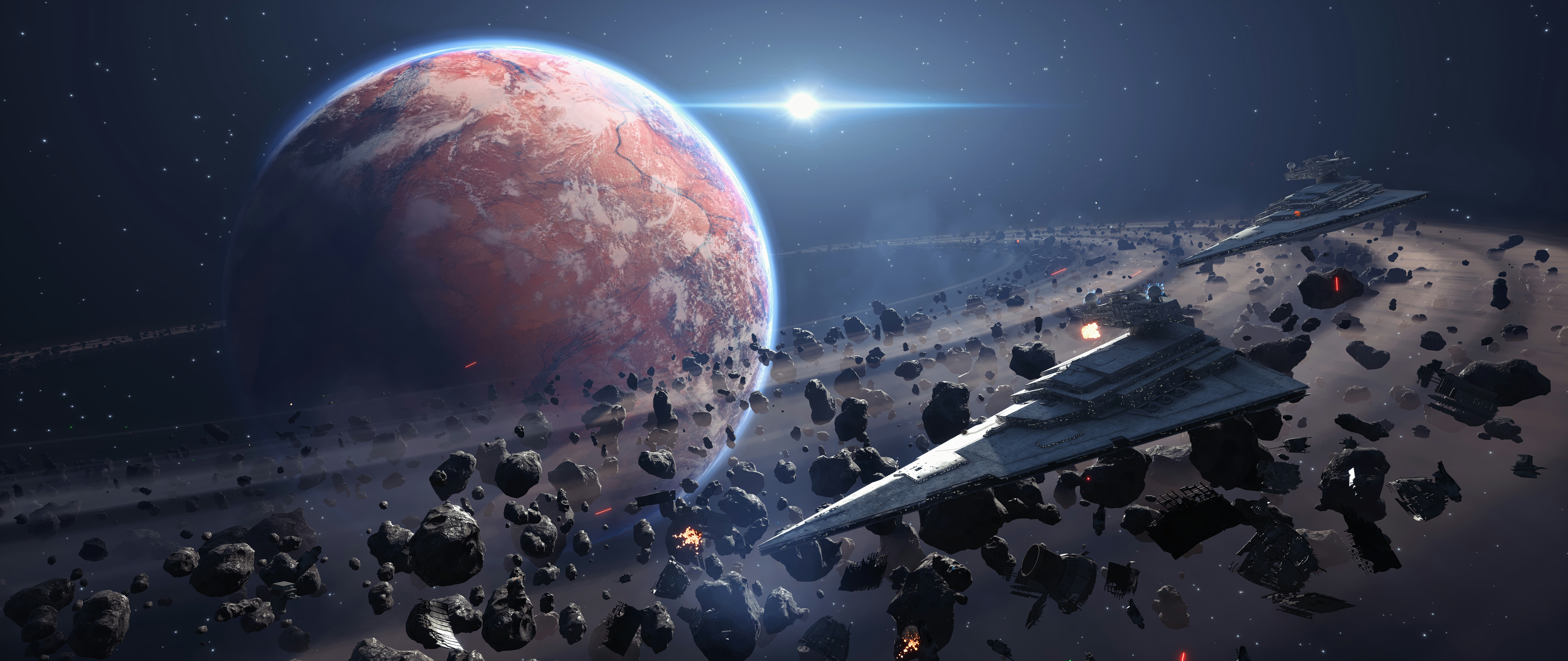 Description: A star wars scene with a spaceship and a red planet in the background with a star in the sky.