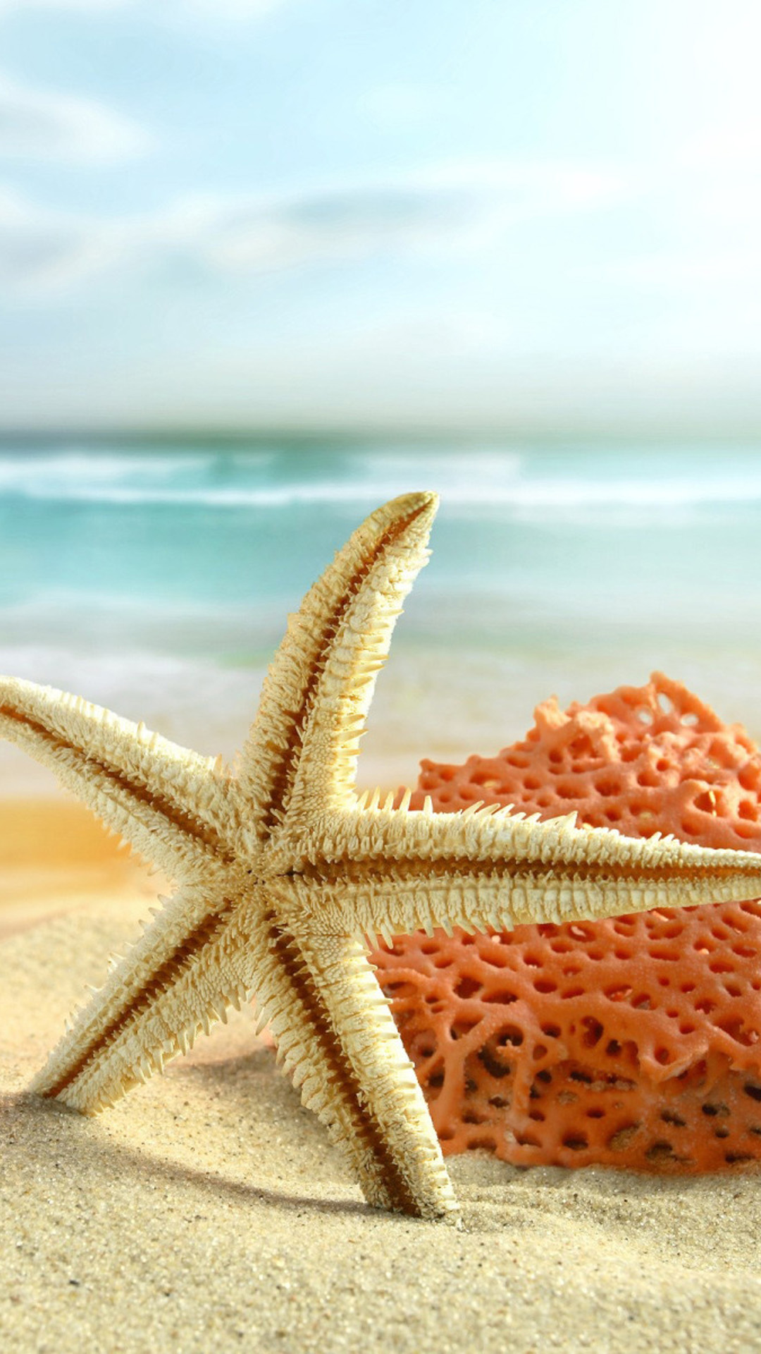 Description: A starfish on a beach with the ocean in the background and a blue sky in the background with clouds.