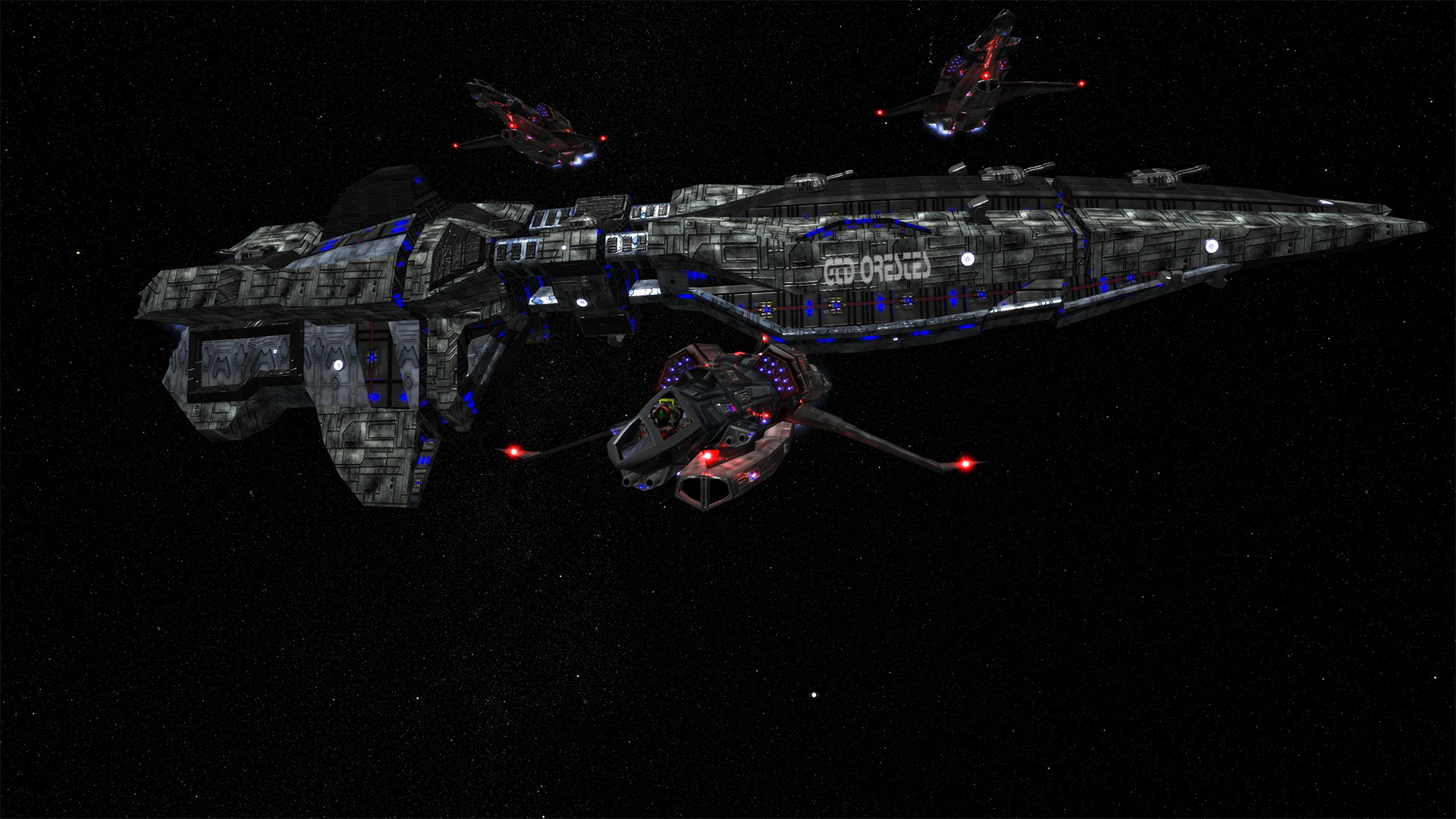 Description: A star trek ship flying through the night sky with a star trek vehicle in front of it and a space shuttle in the background.