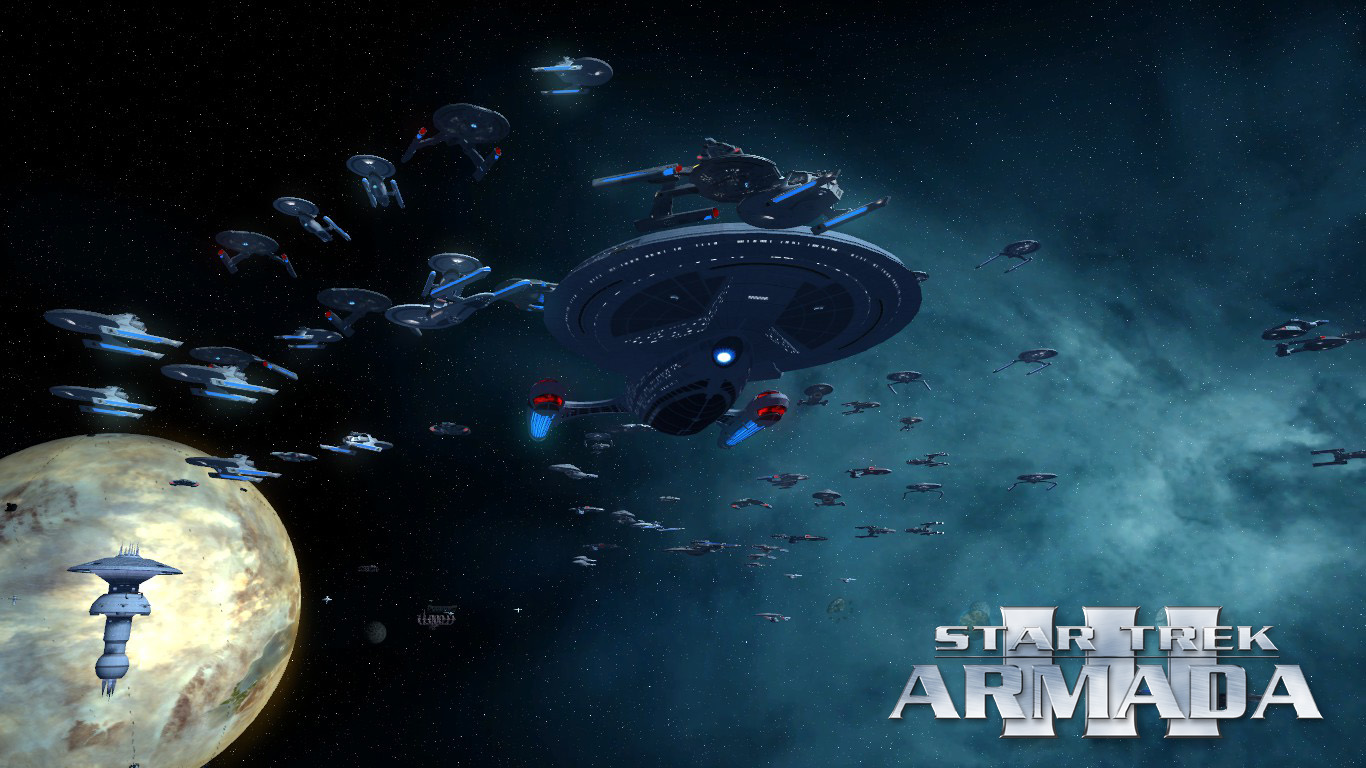 Description: A star trek game with a spaceship and a space station in the background with a planet in the foreground.