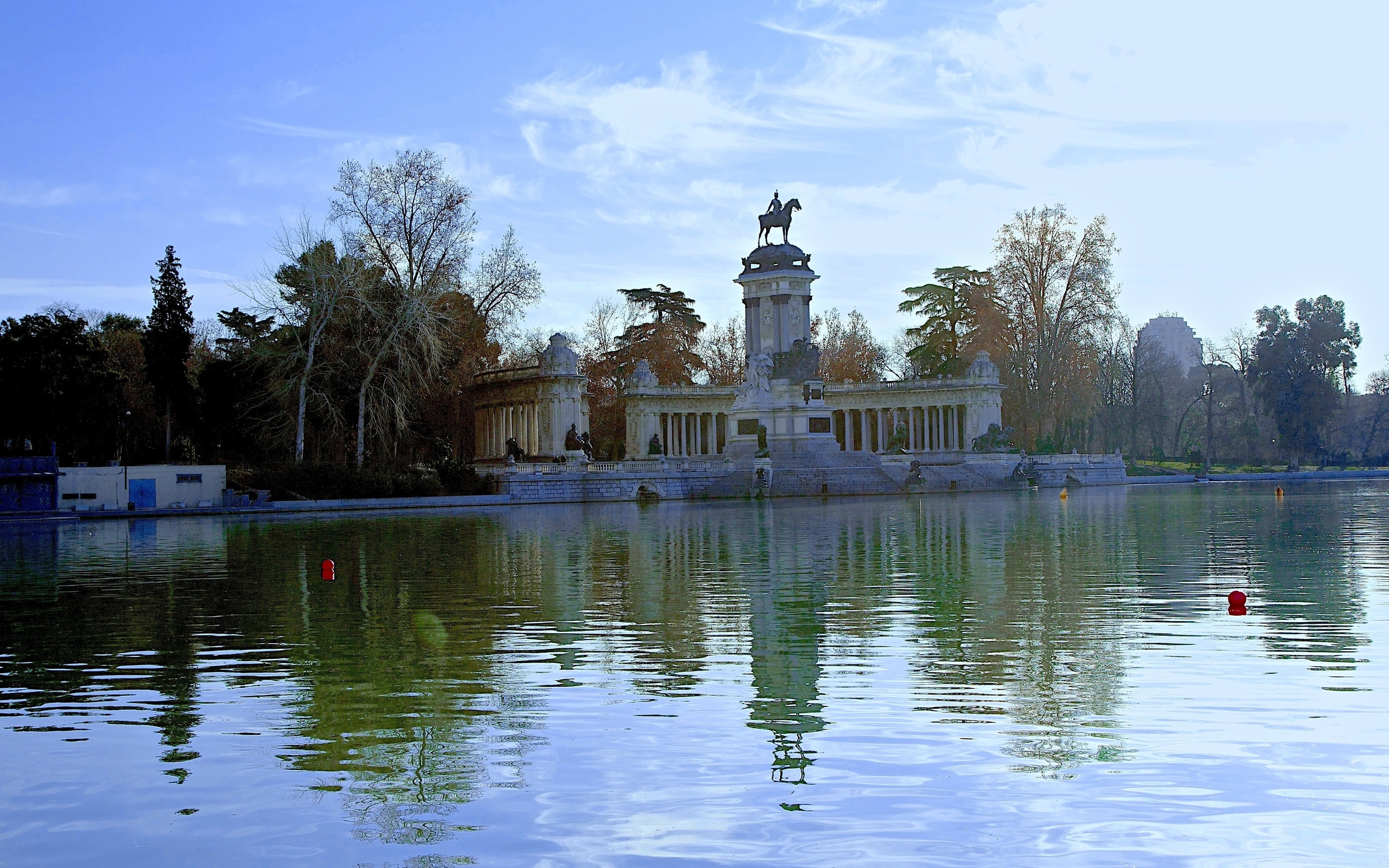 Description: A statue is in the middle of a lake with a red buoy in the foreground and a building in the background.