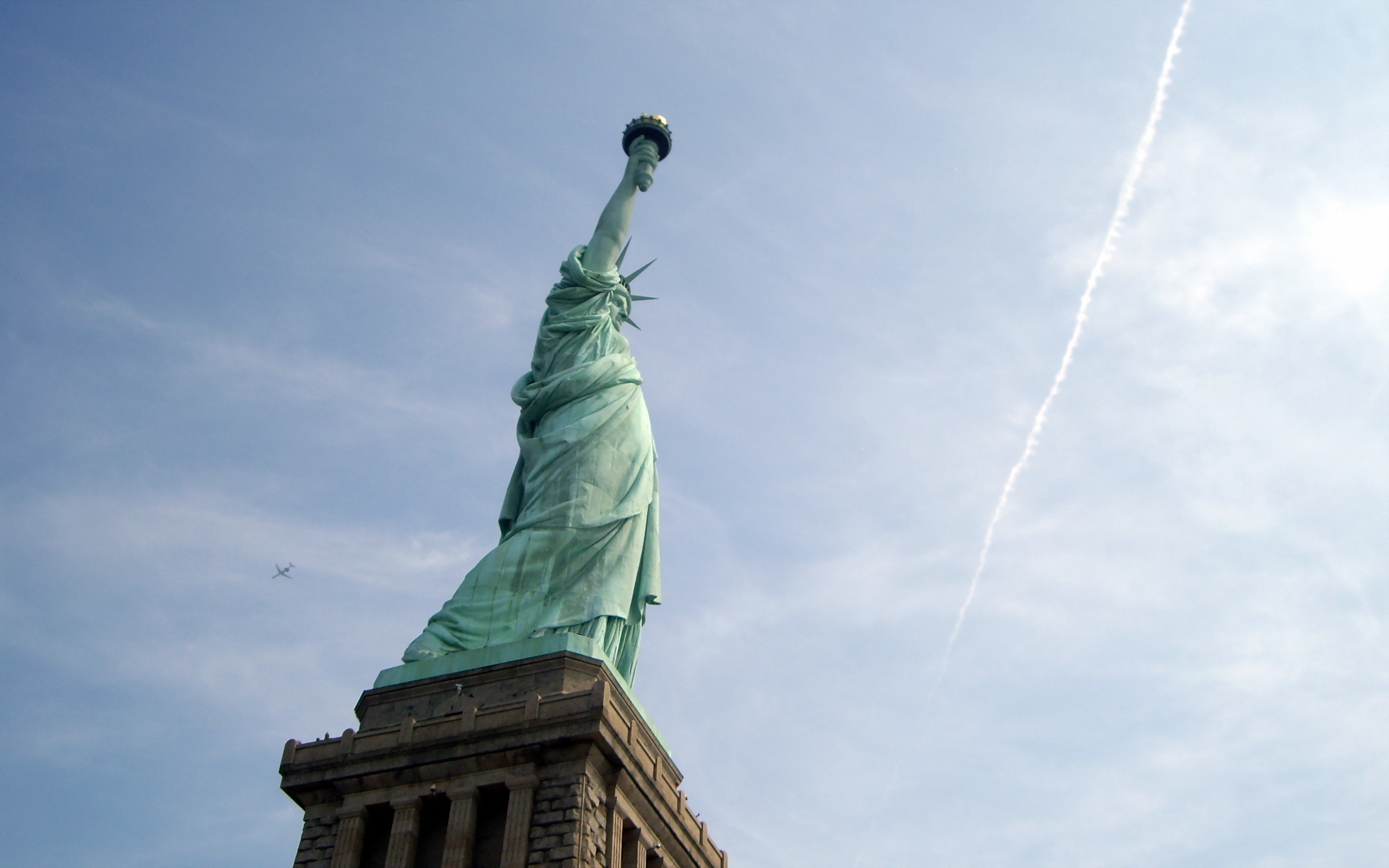 Description: A statue of liberty is shown against a blue sky with a jet trail in the background and a plane flying overhead.