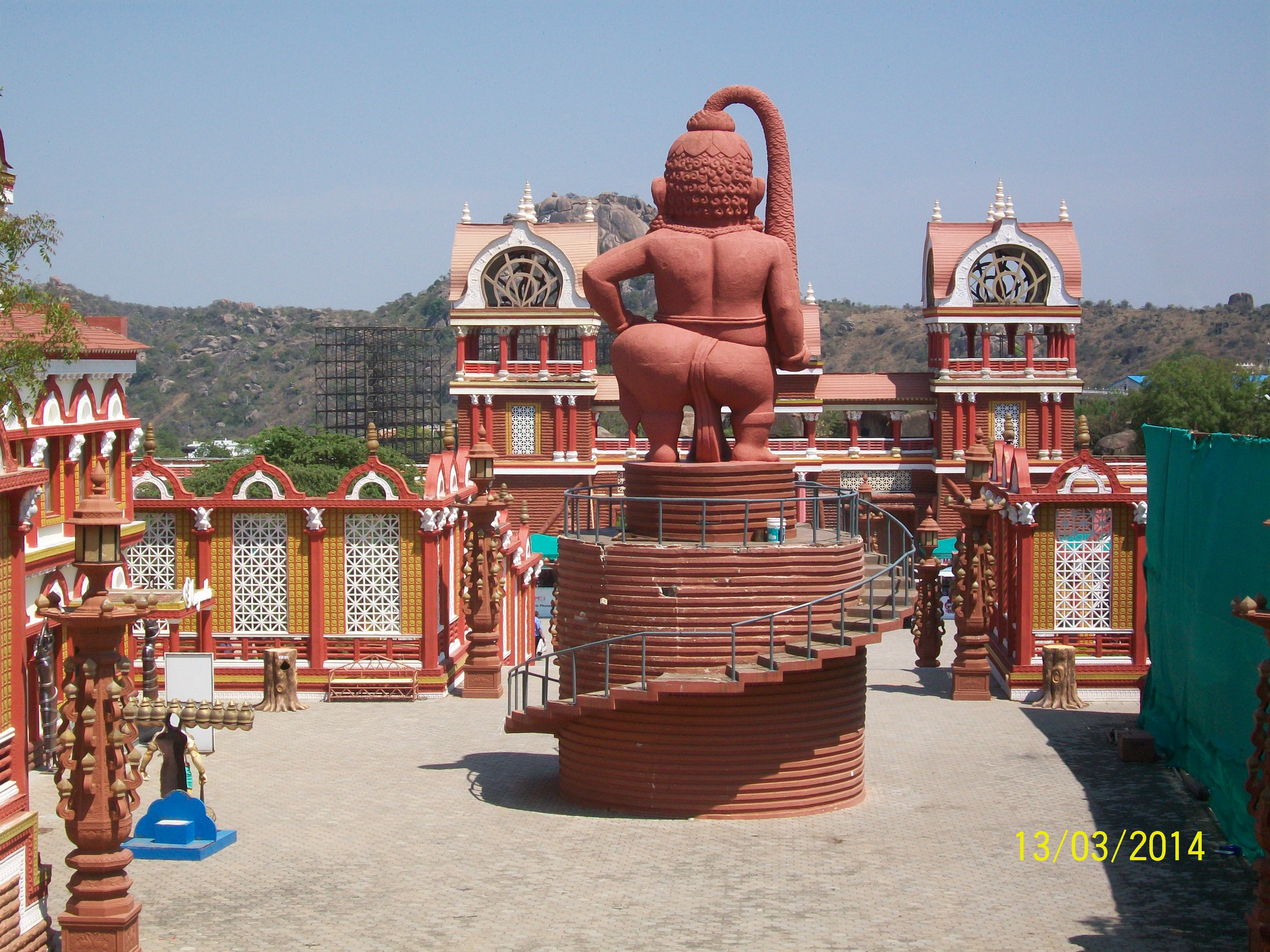 Description: A statue of a man is in front of a building with a spiral staircase and a statue of a man.