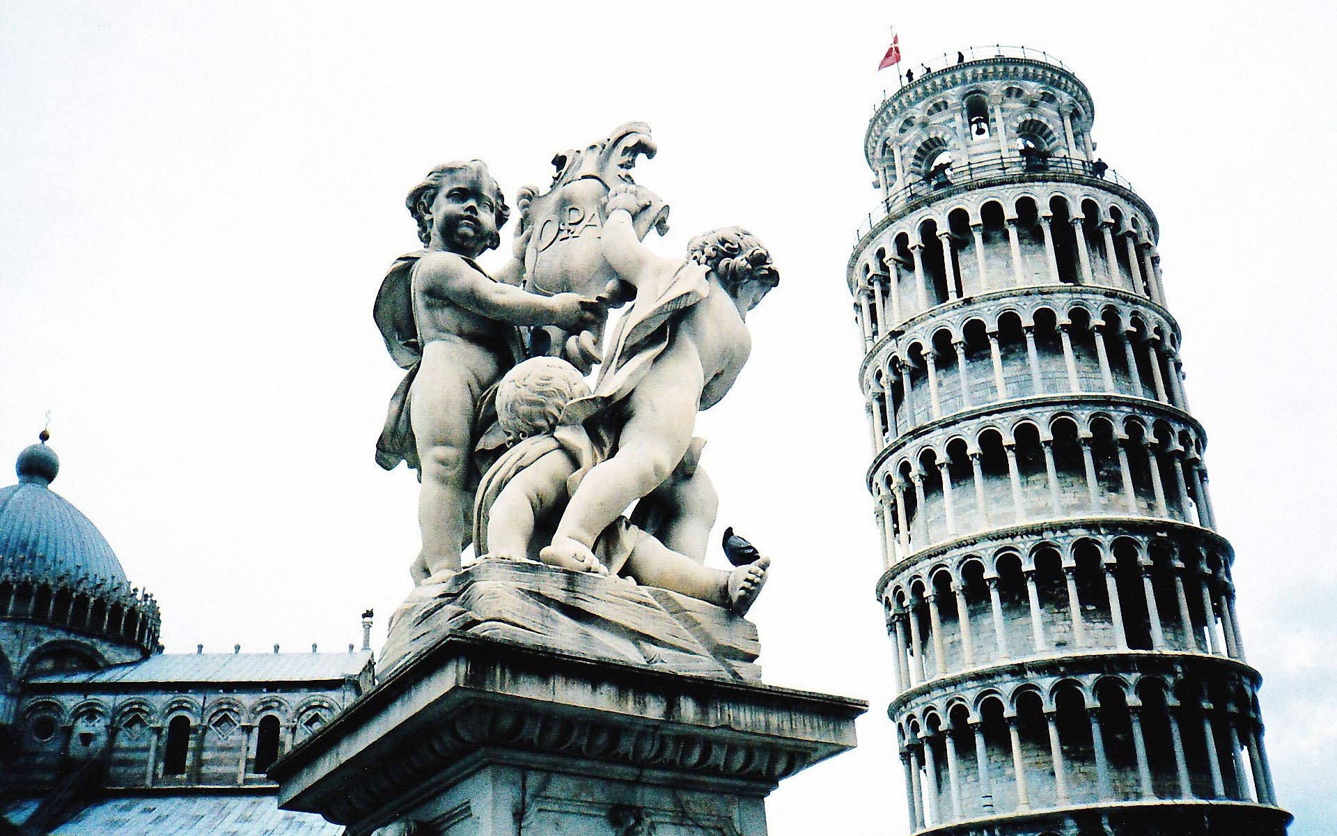 Description: A statue of a man holding a woman in front of a tower of pisa.