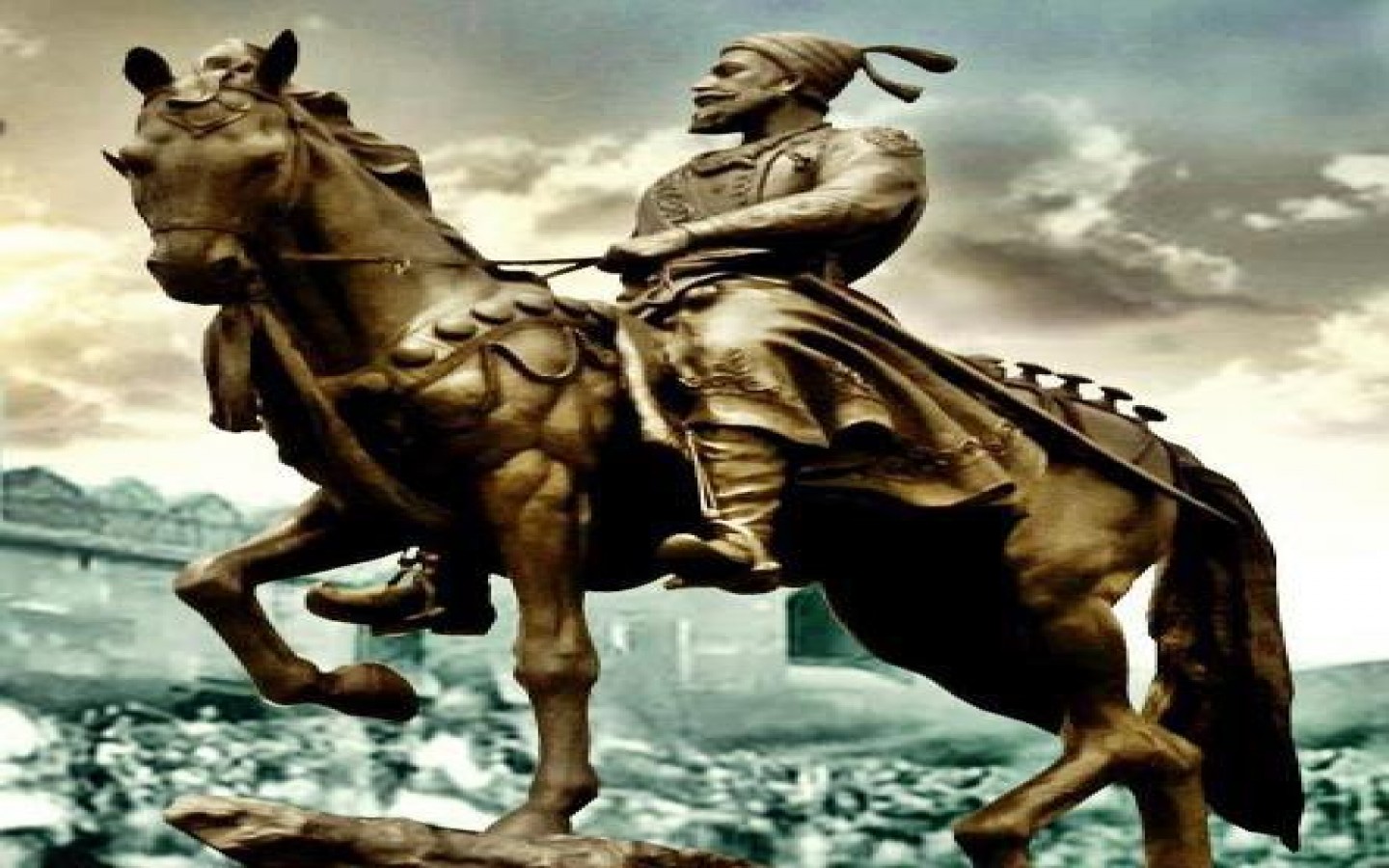 Description: A statue of a man riding a horse in front of a crowd of people in a city square with a cloudy sky.