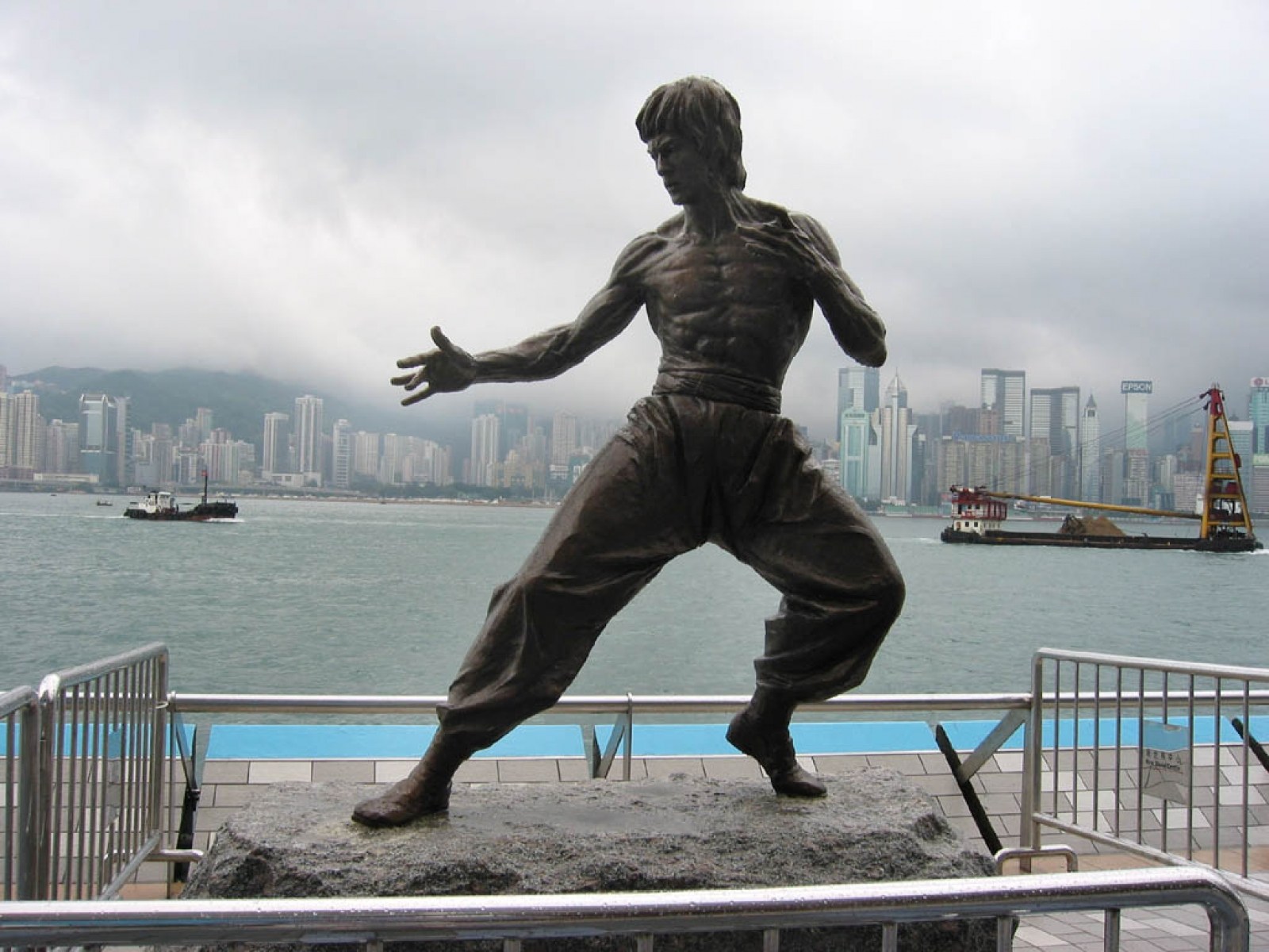 Description: A statue of a man standing on a rock near the water with a city in the background and a boat in the water.