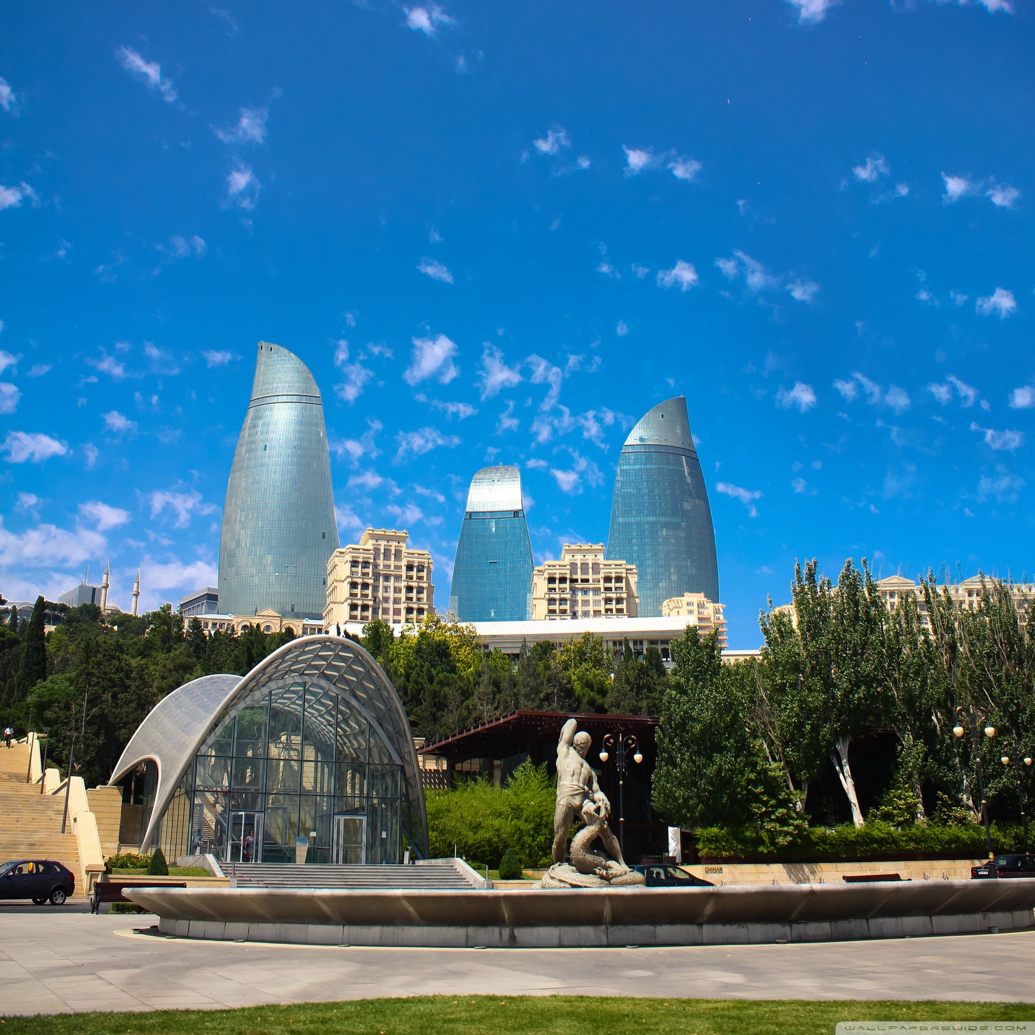 Description: A statue of a woman in front of a building with a sky background and a blue sky with clouds.