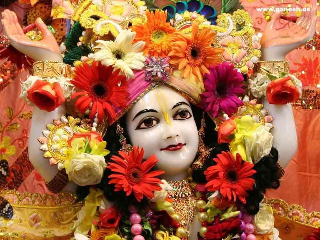 Description: A statue of a woman with flowers in her hair and a garland around her neck and head.
