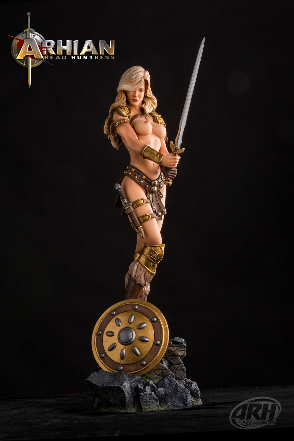 Description: A statue of a woman with a sword and armor on a rock with a black background and a black backdrop.