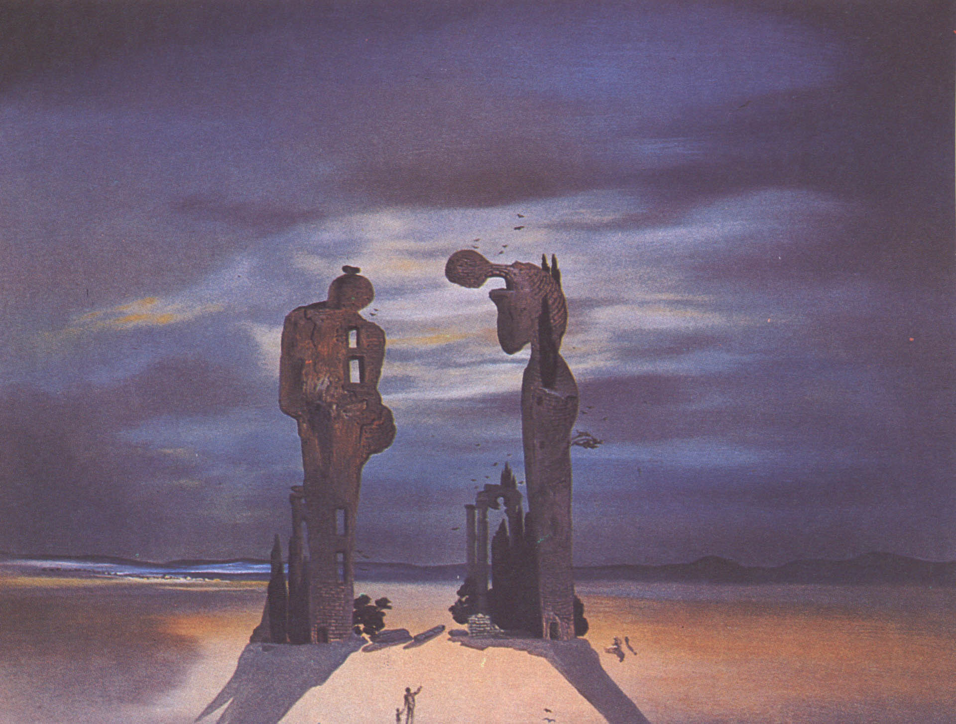 Description: A painting of two statues in the snow with a sky background and clouds in the background.